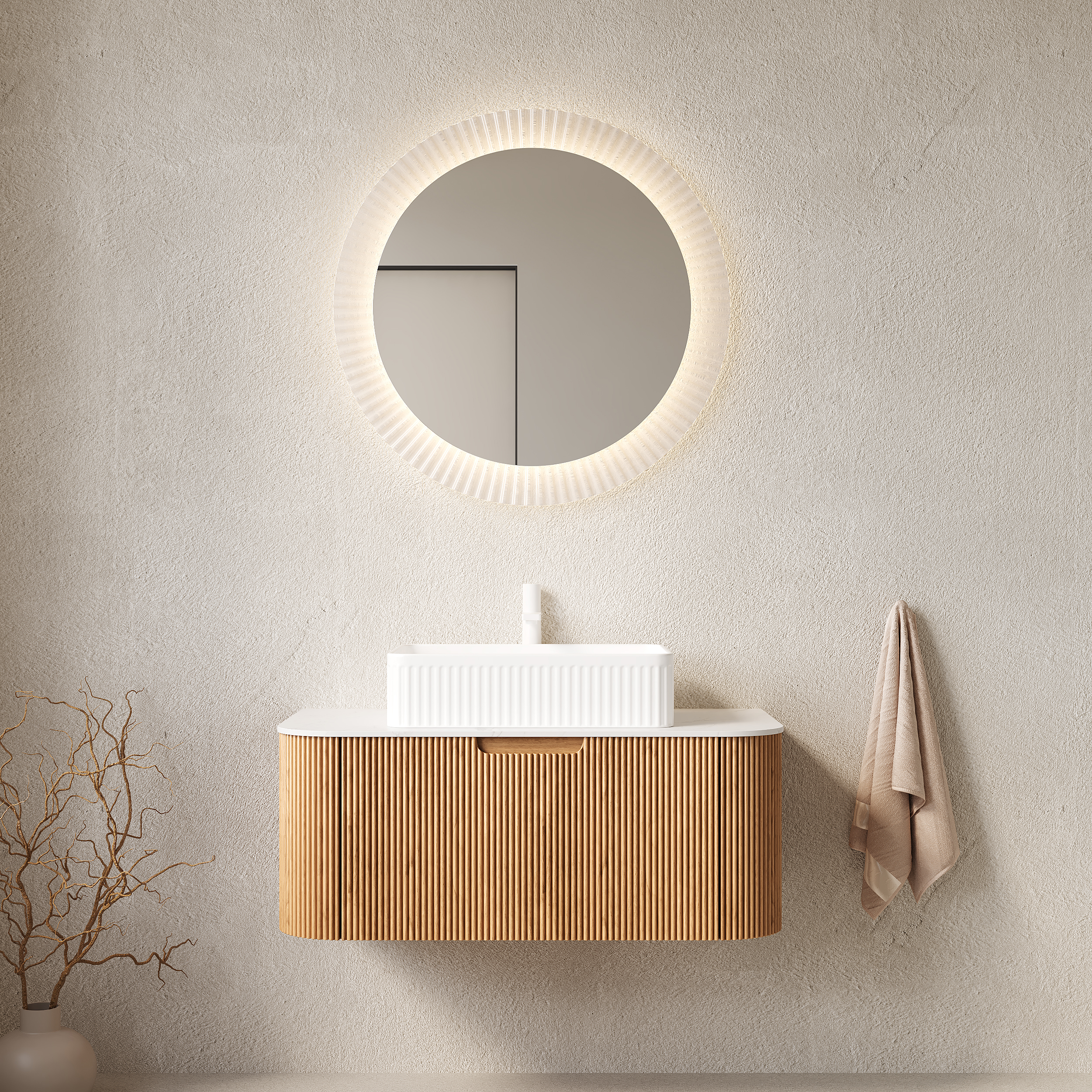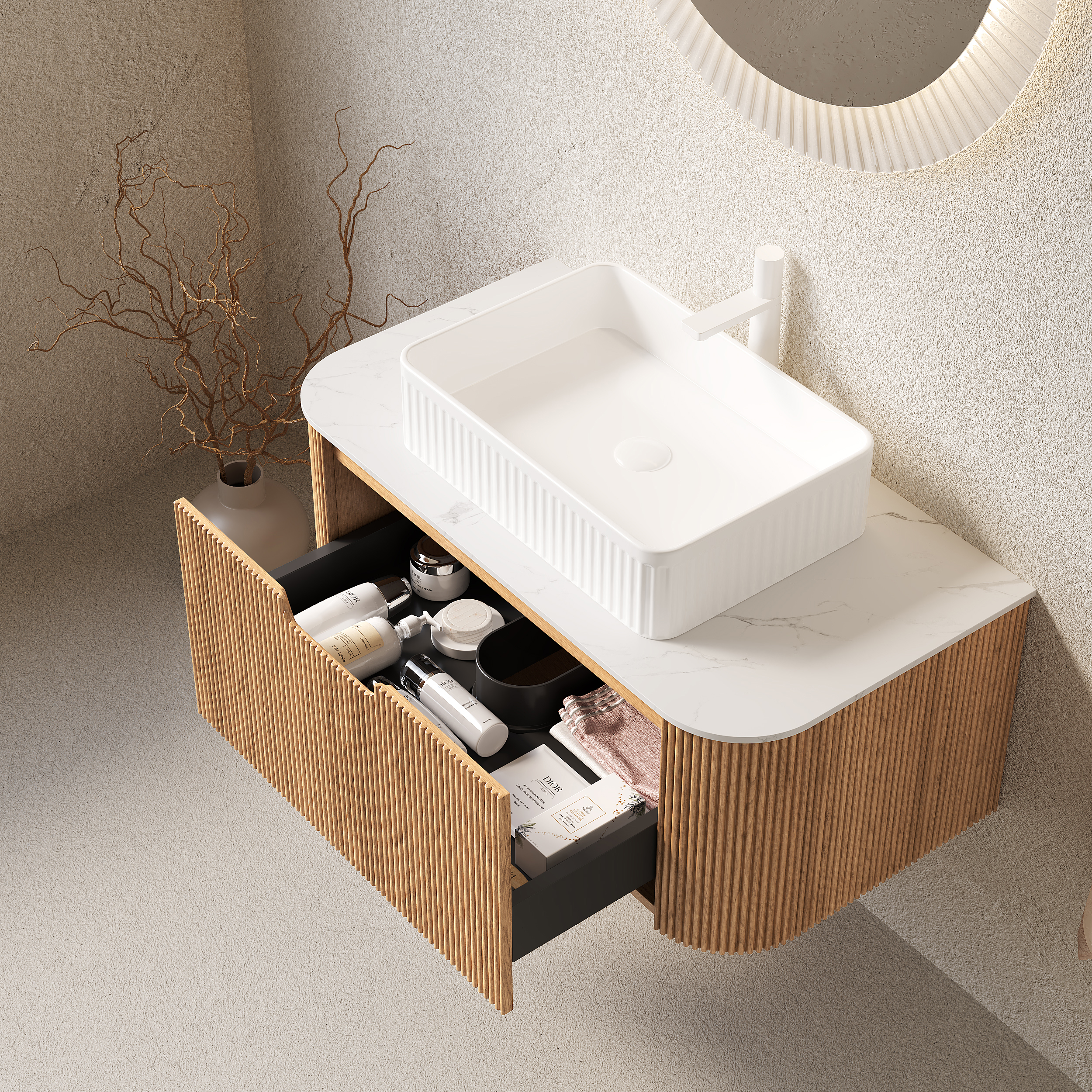 Product Name:DINA 36" Bathroom Vanity with Sink, Wall-Mounted Floating Curved Edges Striped Bathroom Storage Cabinet with Drawer, White Rectangular Ceramic Basin, No Faucet, Pre-assembled, Natural Woodgrain Color