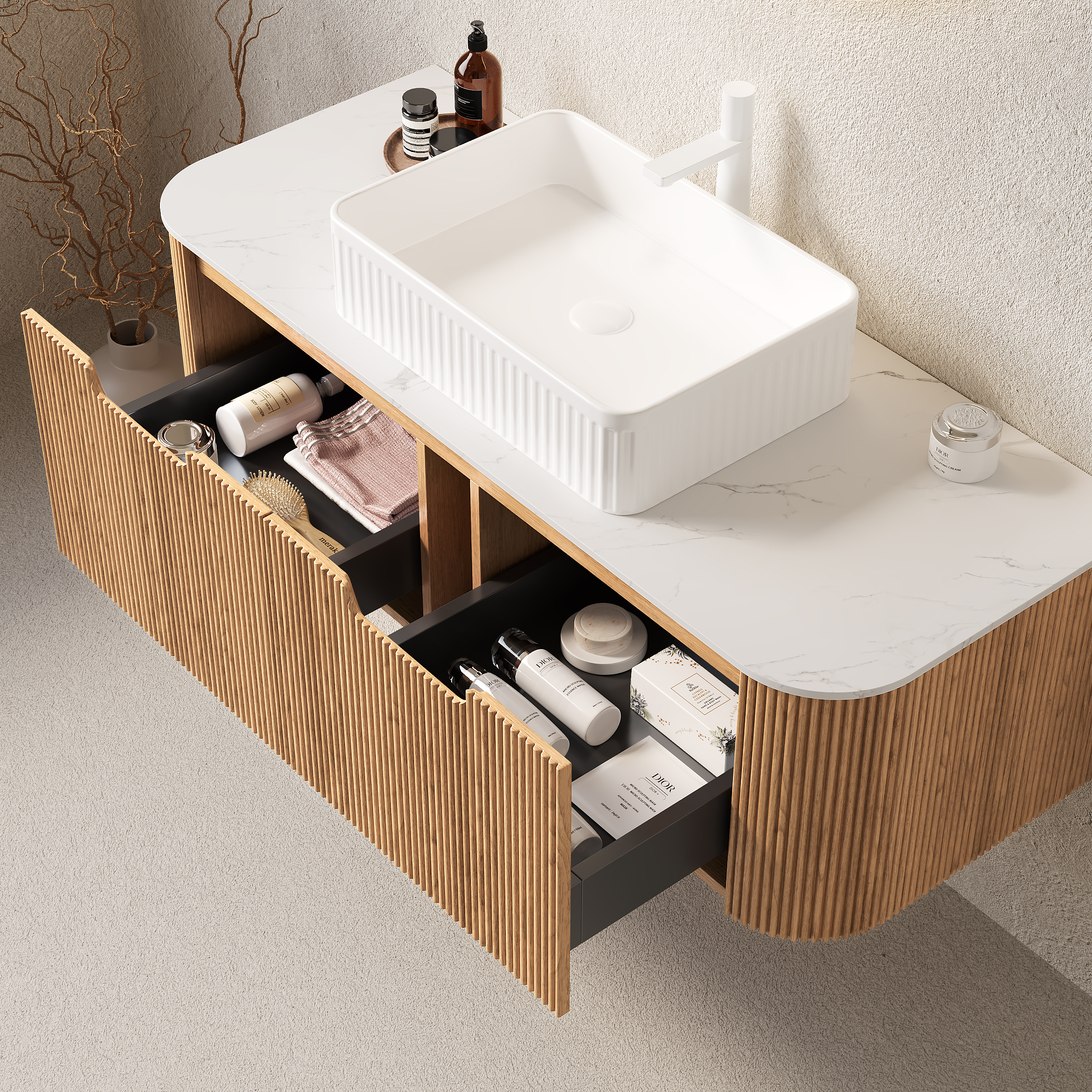 Product Name:DINA 48" Bathroom Vanity with Sink, Wall-Mounted Curved Edges Striped Bathroom Storage Cabinet with 2 Drawers, White Rectangular Ceramic Basin, No Faucet, Pre-assembled, Natural Woodgrain Color
