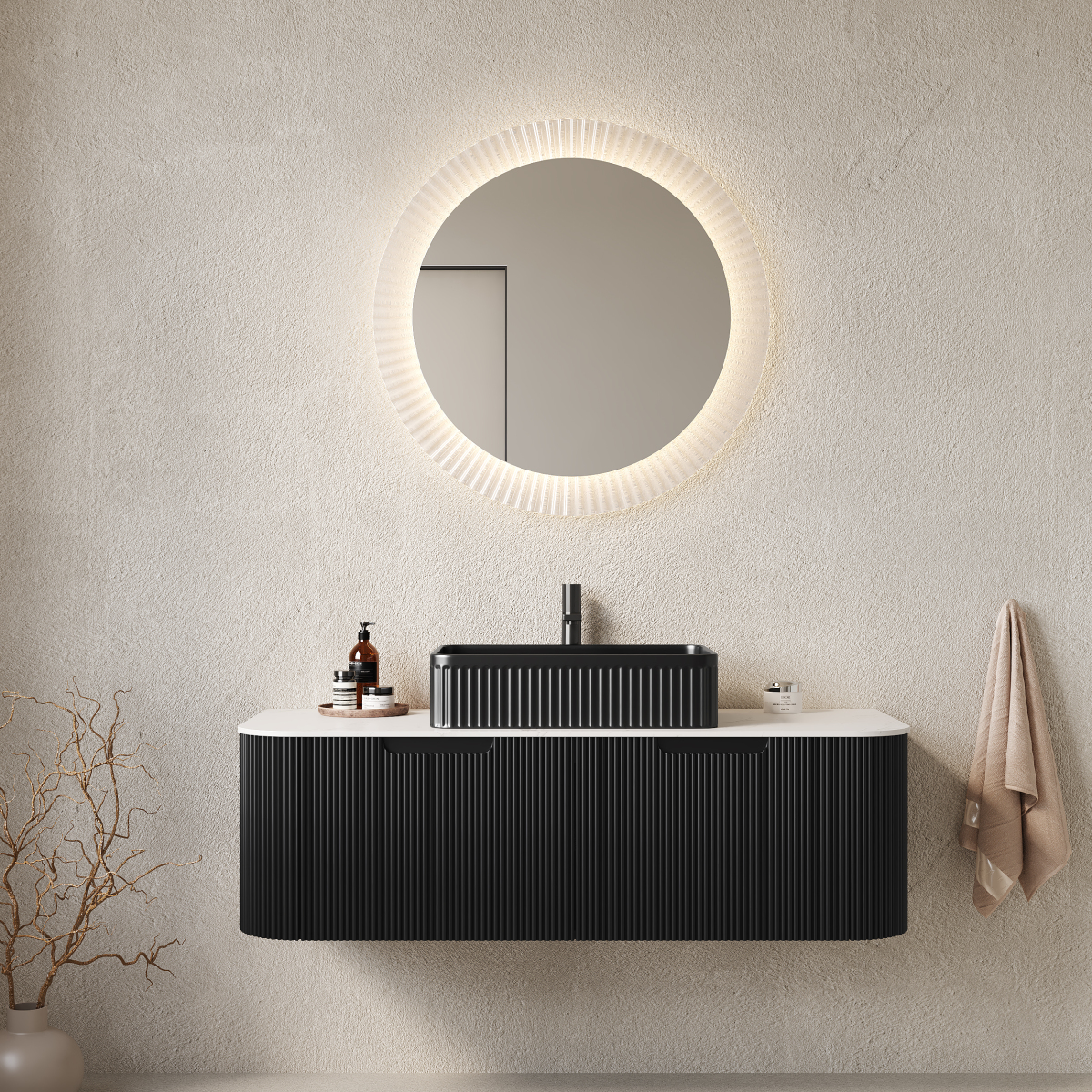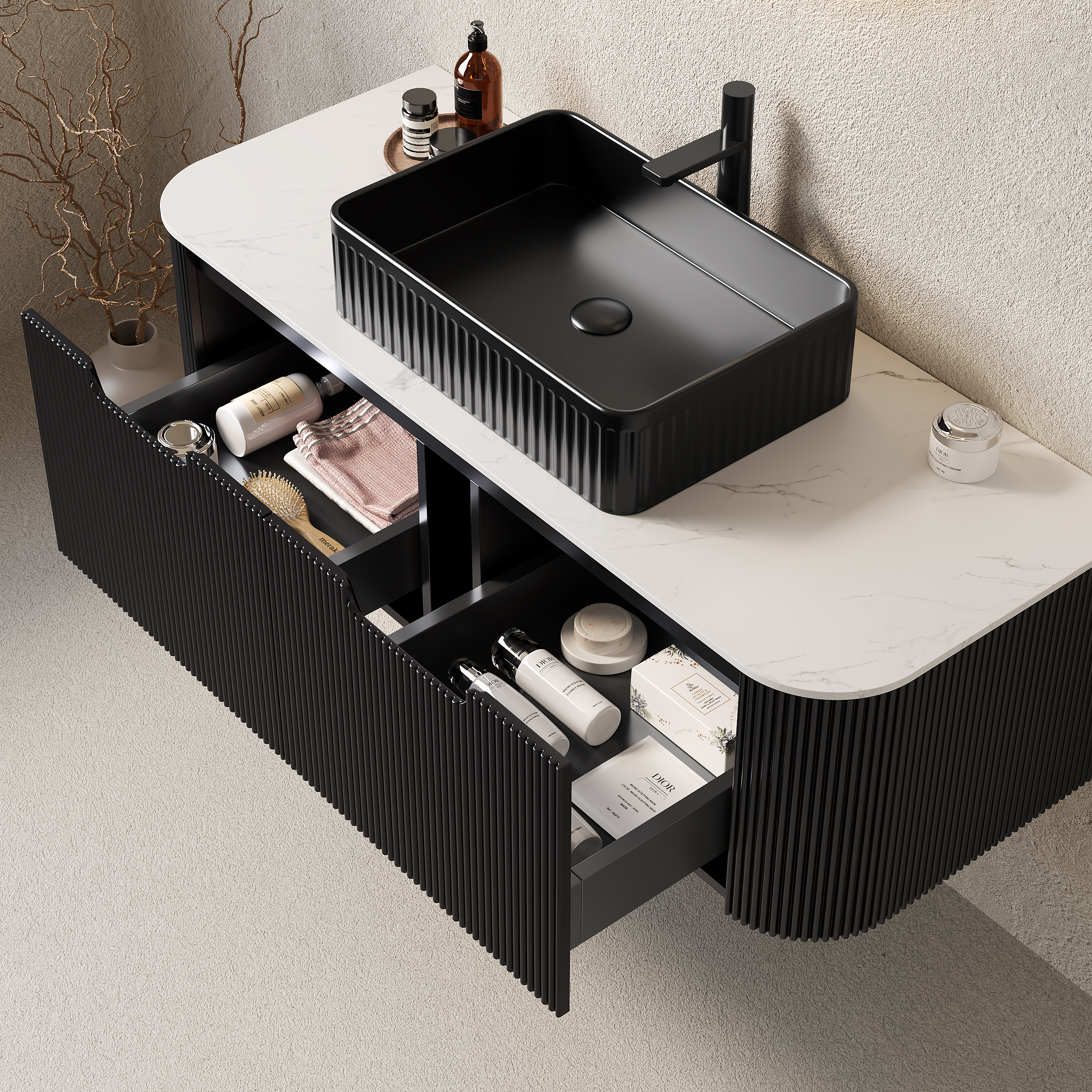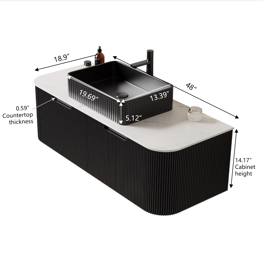 Product Name:DINA 48" Bathroom Vanity with Sink, Wall-Mounted Floating Curved Edges Striped Bathroom Storage Cabinet with 2 Drawers, Black Rectangular Ceramic Basin, No Faucet, Pre-assembled, Black Color