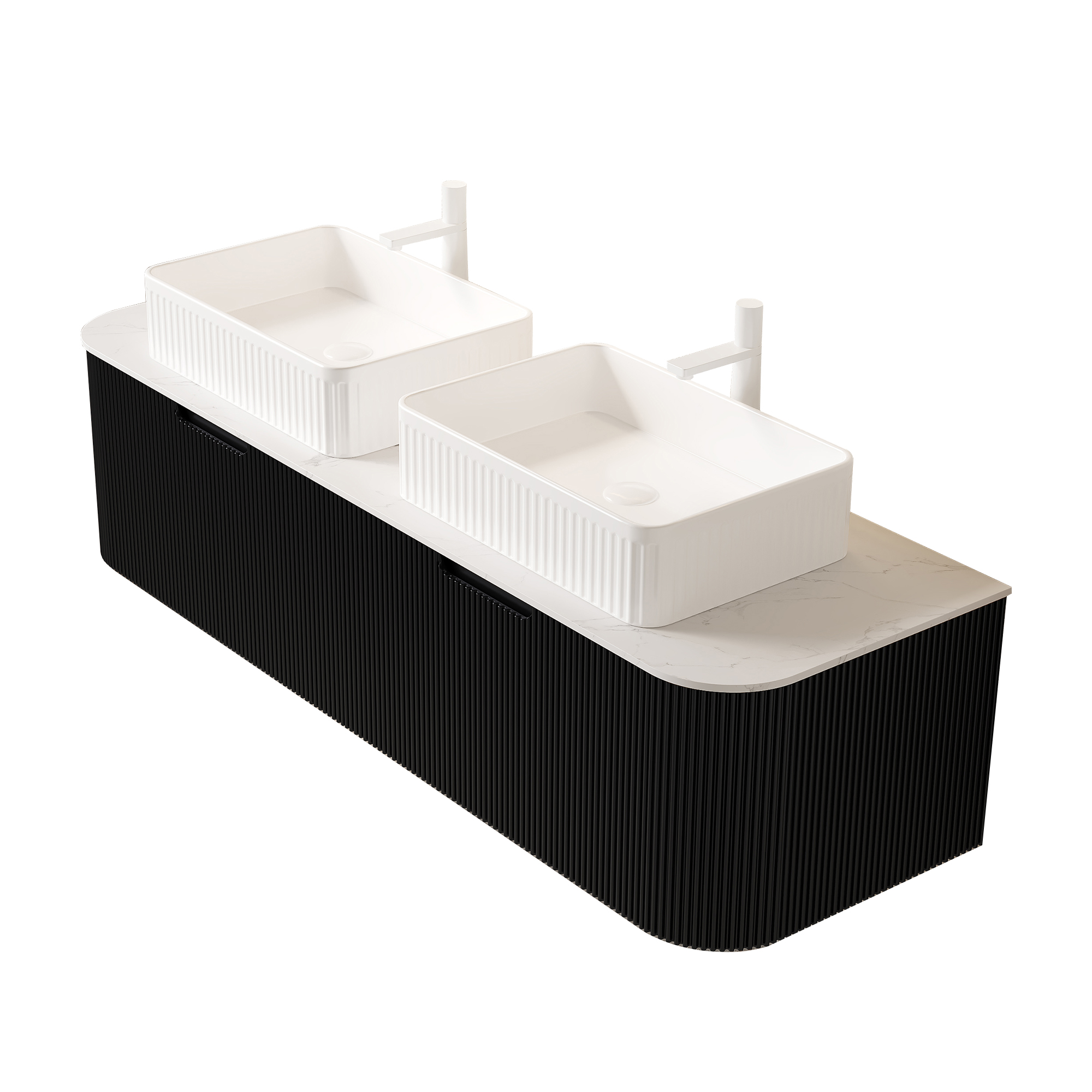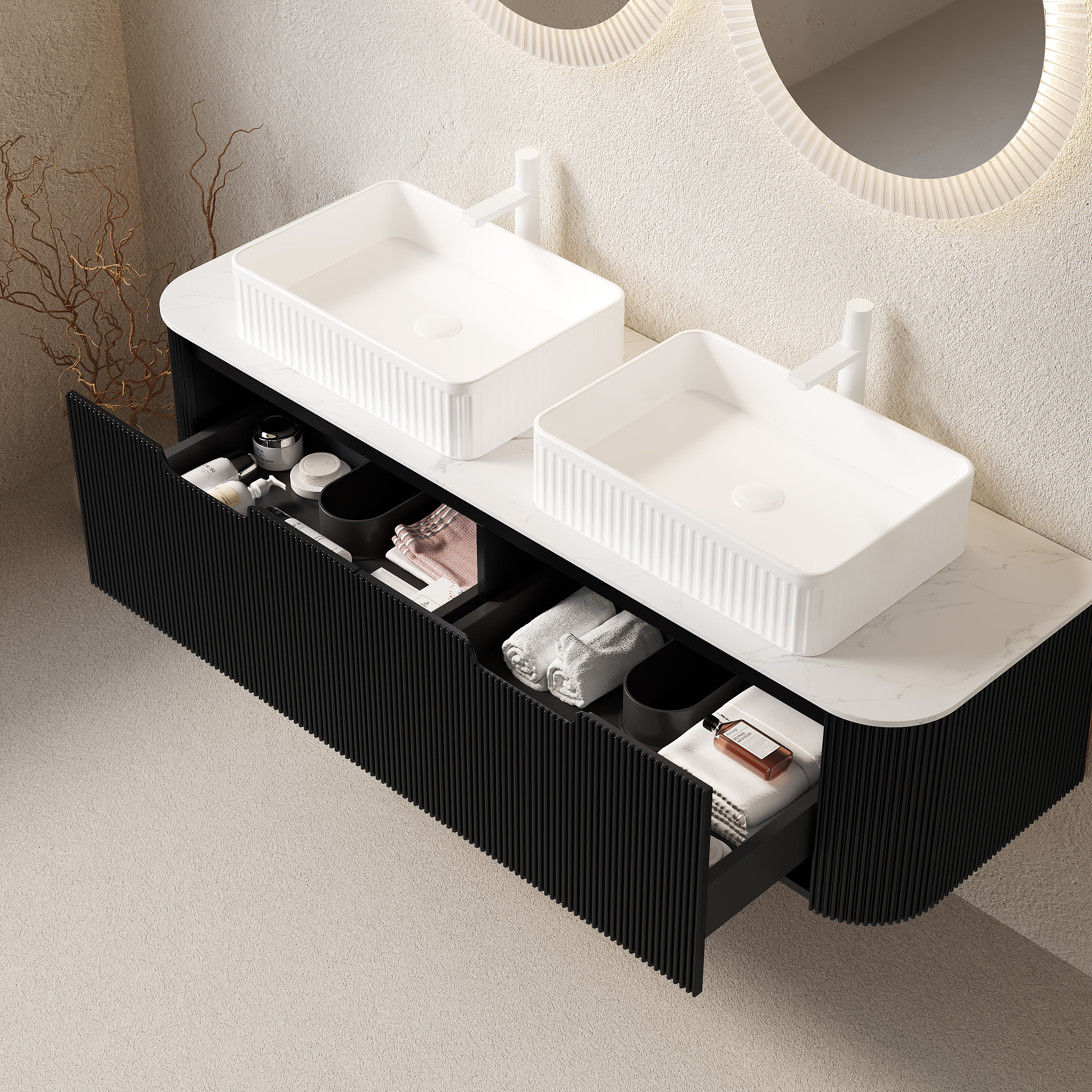 Product Name:DINA 60" Bathroom Vanity with Sinks, Wall-Mounted Floating Curved Edges Striped Bathroom Storage Cabinet with 2 Drawers, 2 White Rectangular Ceramic Basins, No Faucet, Pre-assembled, Black Color