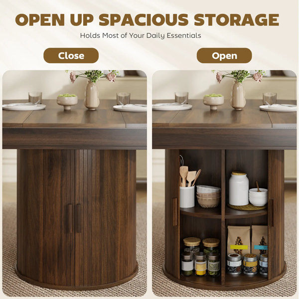 Features: - Flexible tabletop extension adapts seamlessly to suit different gatherings - Smooth sliding rails ensure effortless table extension and setup - Store extension boards beneath tabletop for convenience - Eight compartments and open shelf offer ample space for cutlery, plates, or decor - Sliding door base blends farmhouse charm with practical storage solutions - Melamine-coated surface resists scratches and ensures simple cleaning - Versatile design complements dining, working, or creative activities beautifully - Assembly required Specification: - Color: Walnut - Materials: Particleboard, MDF - Expanding Dimensions: 59.1" L x 43.3" W x 29.5" H - Unexpanded Dimensions: 43.3" Dia. x 29.5" H - Foldable Desktop Size: 43.3" L x 15.7" W - Tabletop Thickness: 0.7" - Single Fan-Shaped Compartment: 22" Dia. - Compartment Height: 11.6" (top), 11.4" (bottom) - Under-Table Storage Space: 35.4" W x 22.4" D x 3.9" H - Distance from Table Bottom to Top: 28.7" - Base Size: 23" Dia. - Weight Capacity: 110 lbs. (overall), 88 lbs. (tabletop), 22 lbs. (storage compartment), 5.5 lbs. (single sector shelf) - Mini Space Suggested: 39 sq.ft. Package Includes: - 1 x Extendable Dining Table - 1 x Manual