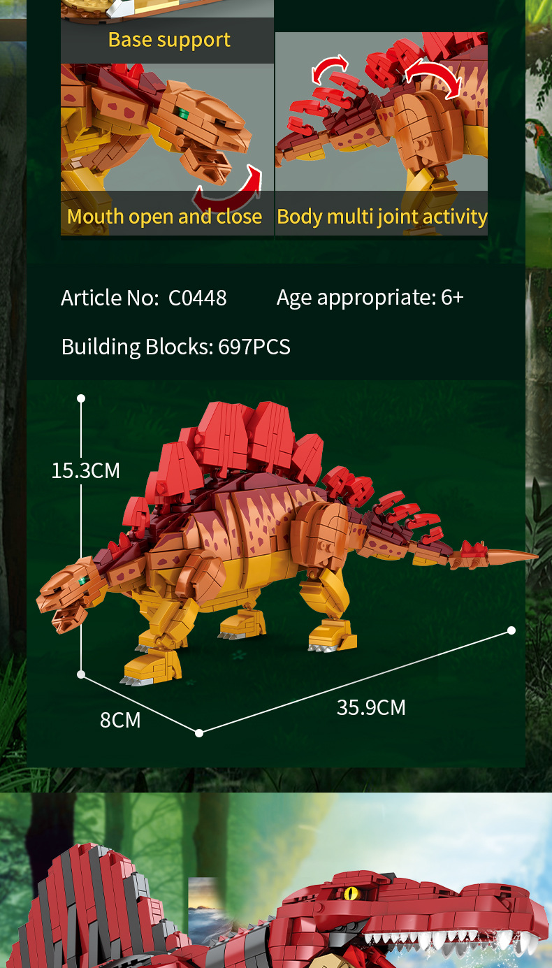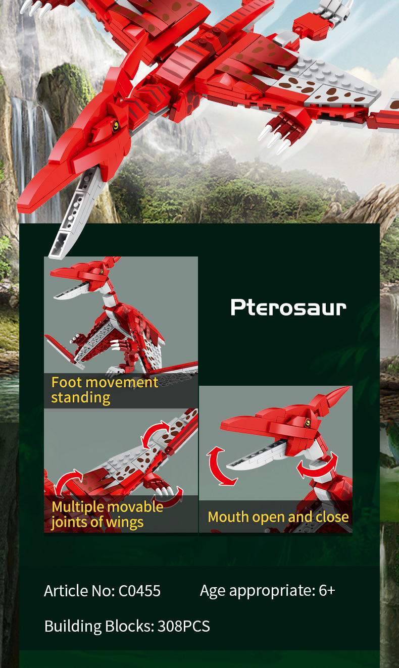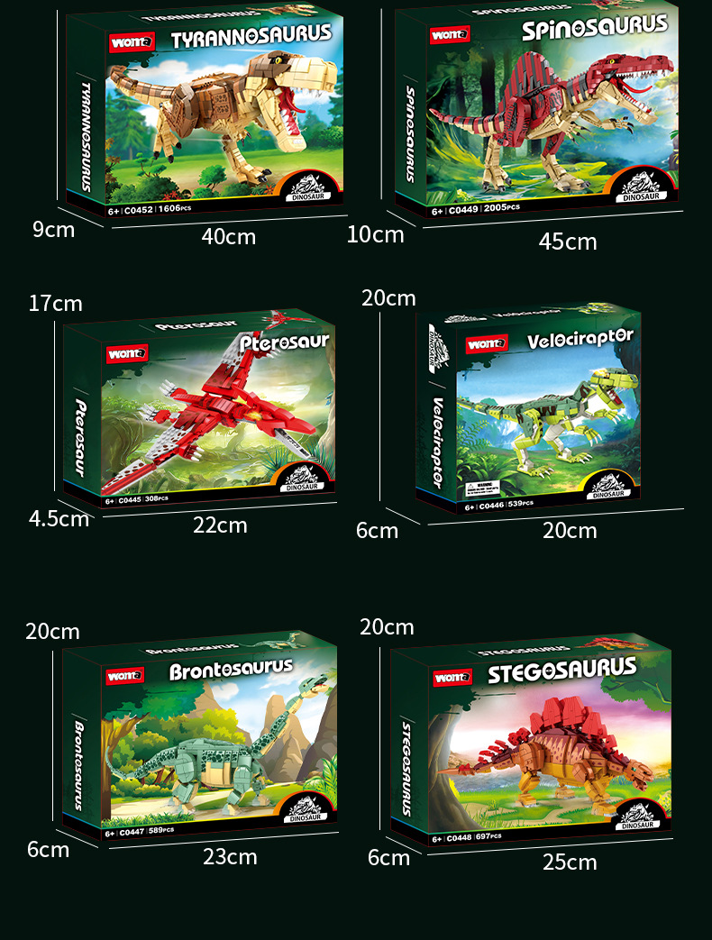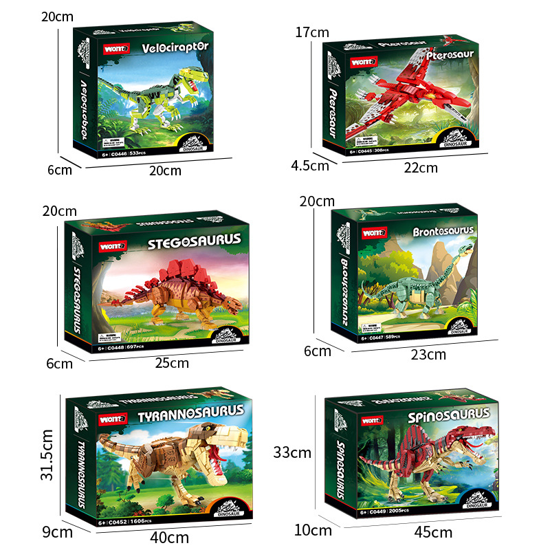 Color: C0445 Pterosaur (English packaging), C0446 Velociraptor (English packaging), C0447 Brachiosaurus (English packaging), C0448 Stegosaurus (English packaging), C0449 Spinosaurus (English packaging), C0452 Tyrannosaurus Rex (English packaging)