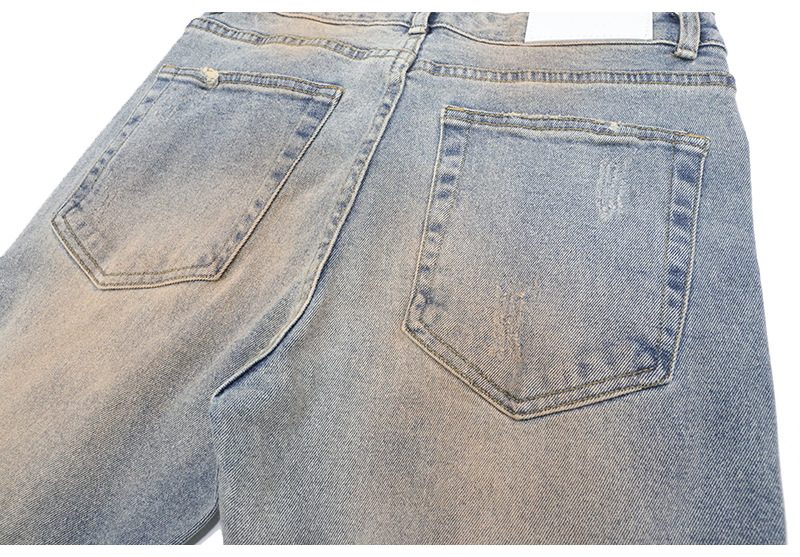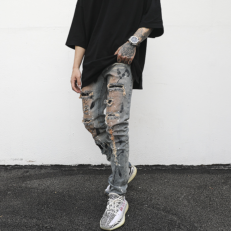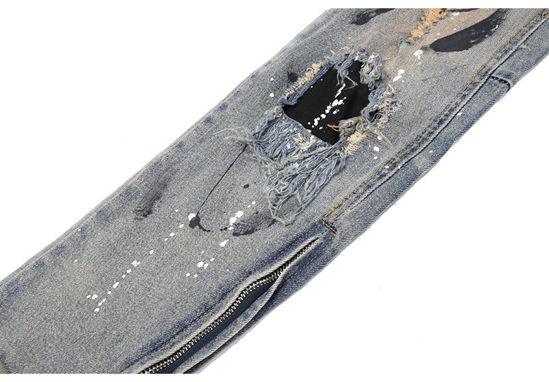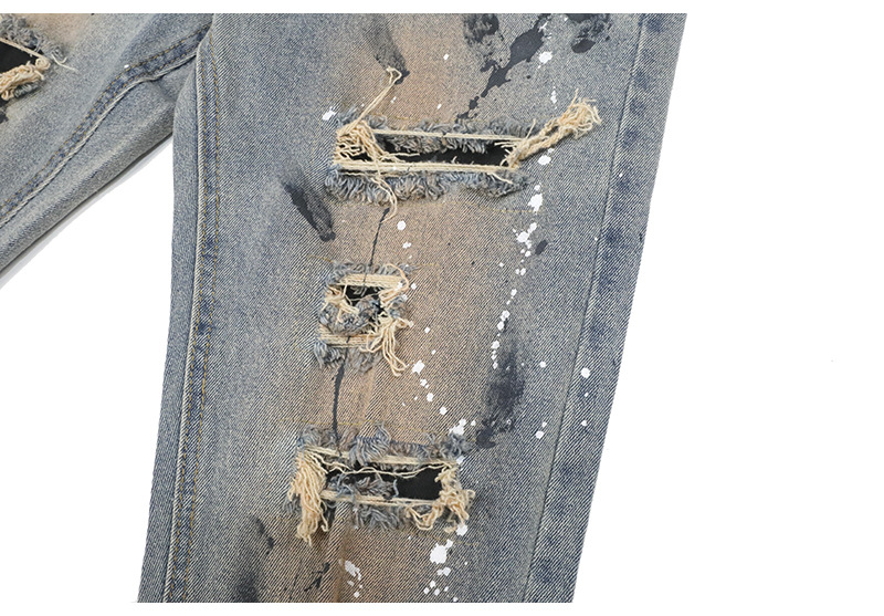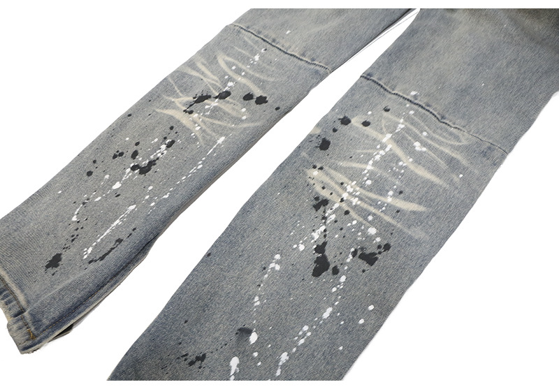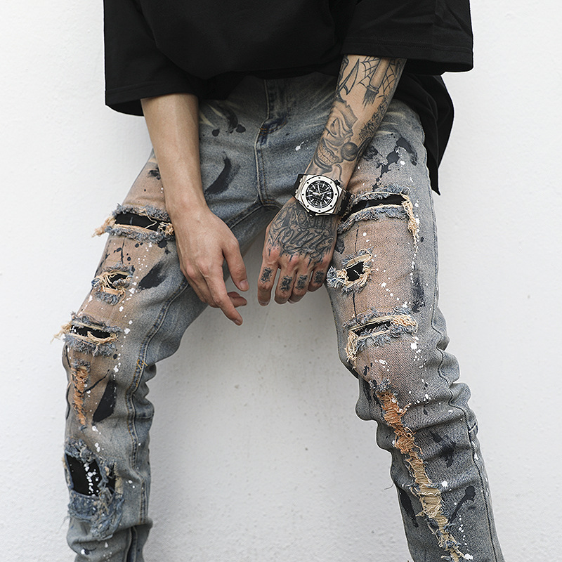 Distressed And Ink-sprayed Small-footed Jeans With Ripped Patches