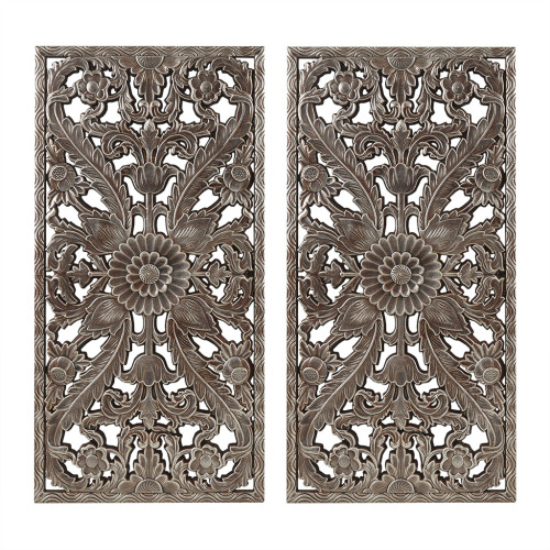Complete your home decor with our Madison Park Botanical Panel Distressed Carved Wood 2-piece Wall Decor Set. This wall decor set features exquisite carved global botanical designs in a durable MDF material creating beautiful texture and dimension, while an antique silver and bronze coat finish adds a unique color and luster. Each piece is finished with two D-rings on the reverse making it easy to hang pieces, either side by side for a more clean look or staggered for a more stylized approach. Perfect for any Living Room, Dining Room, or Entry way - this carved wood panel 2 piece set is the perfect elegant touch to any decor.
