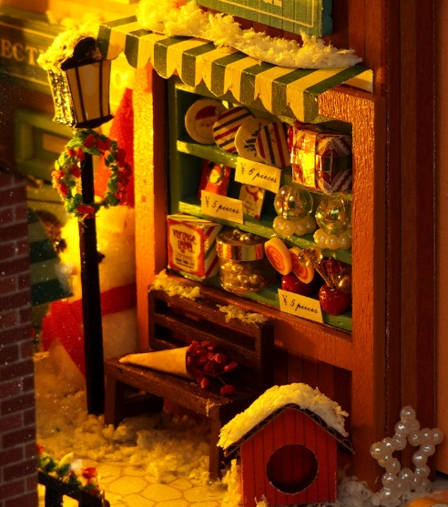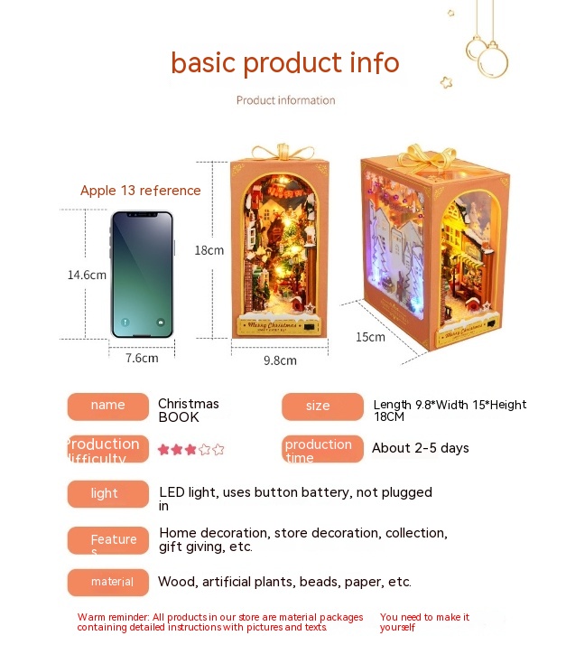 Wooden assembly model+LED light+button battery switch (equipped with 3 LR44 batteries)+1 white latex