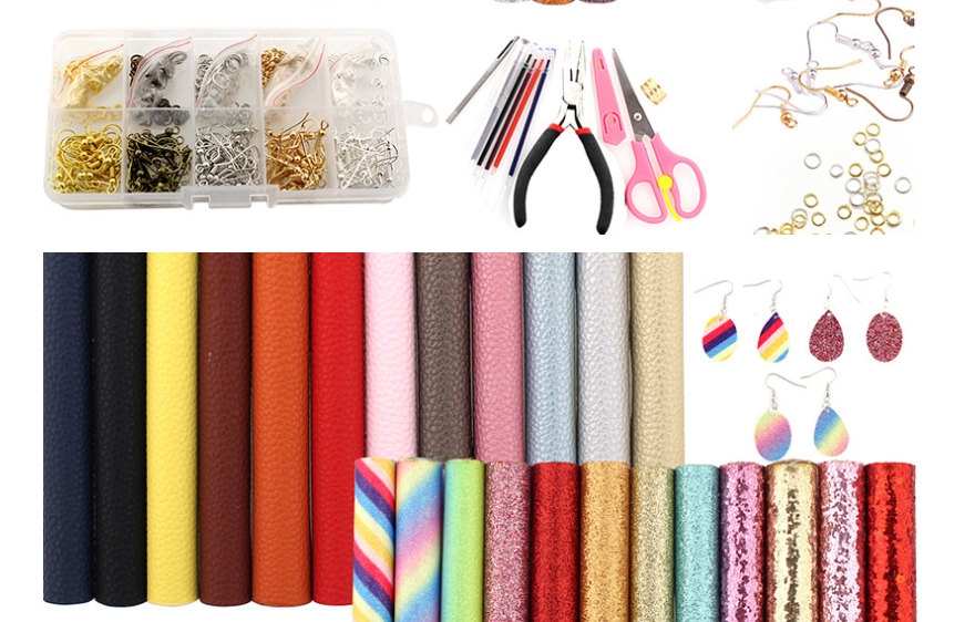 A set of 10 grid material boxes, a pair of sharp pliers, a ring ring, a set of five-color gel pen, a punching punch, a pair of scissors, a 24-color leather, and 17 plastic molds.