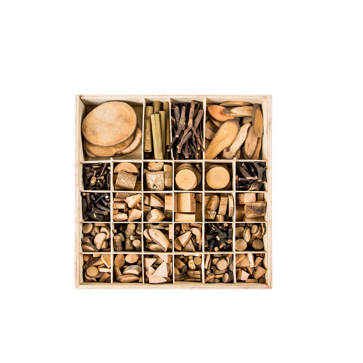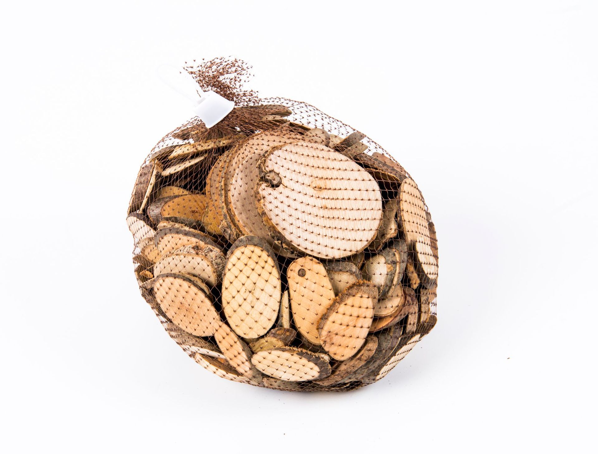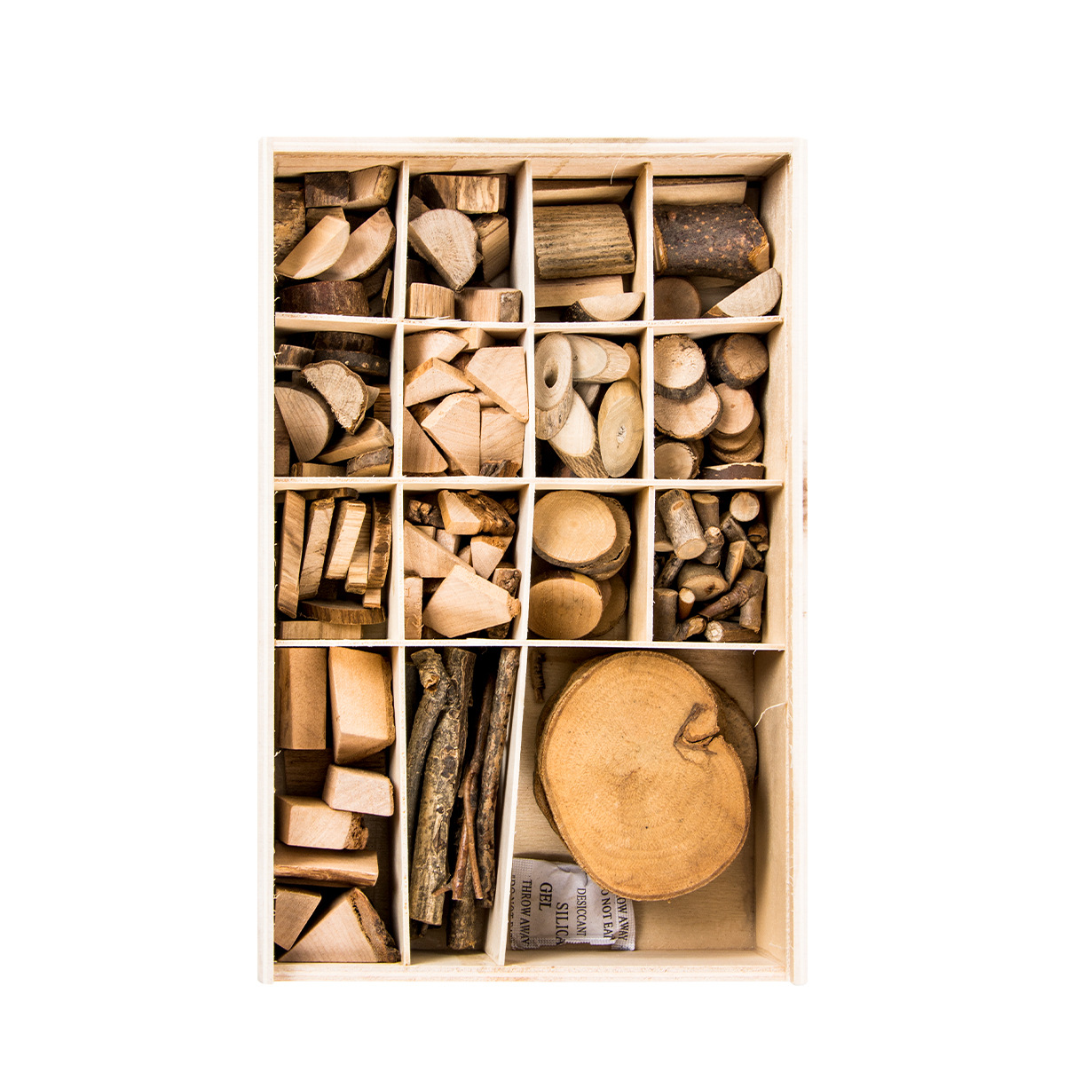 Color: log in small boxes, log in boxes, log in large boxes, round bagged wood chips, oval bagged wood chips.