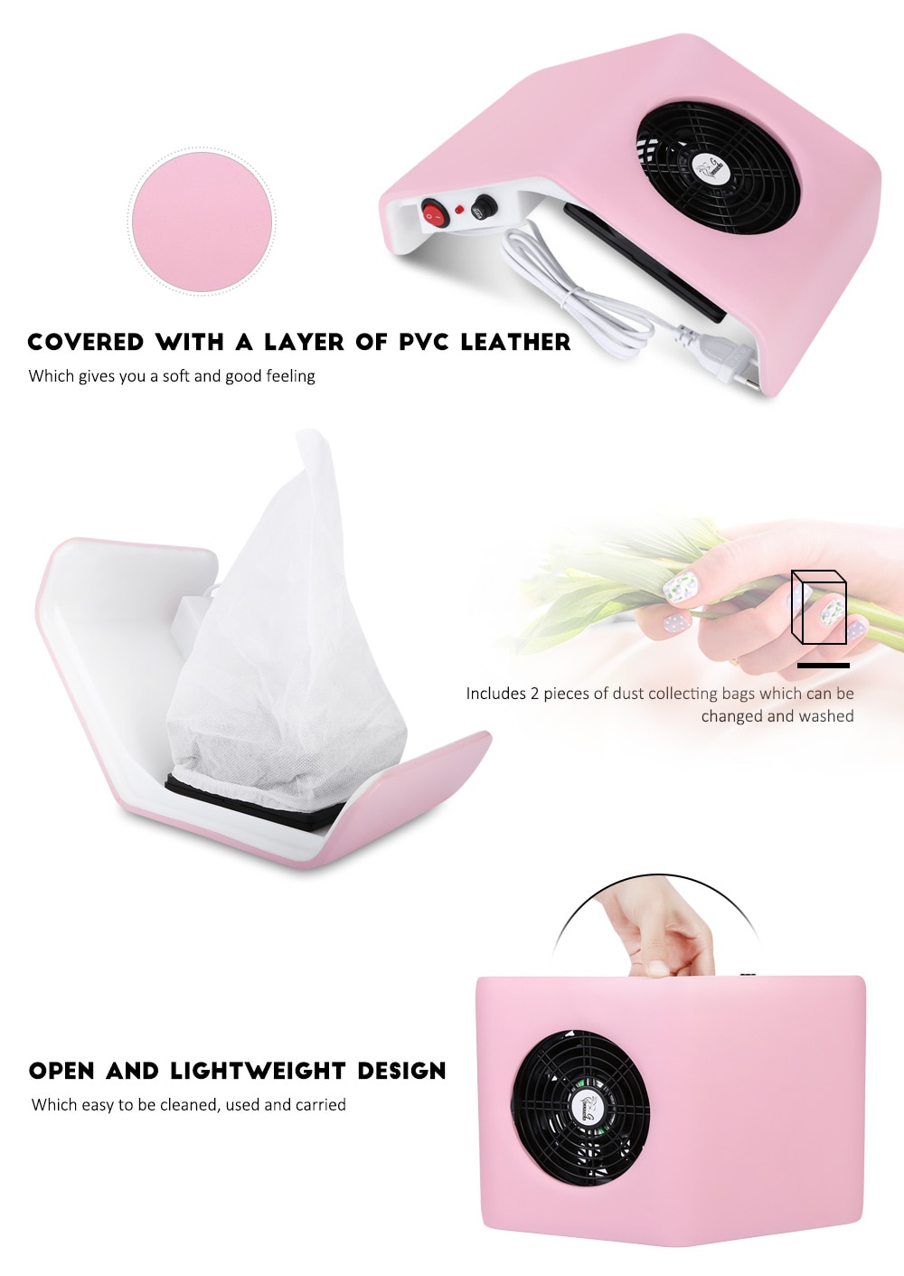 Rugged fan and stable performance to collect dust generated when boring or polishing nails.