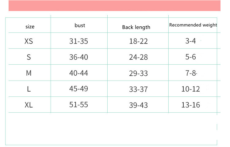 size:XS- about 2-3 kg, S- about 4-6 kg, M- about 7-8 kg, L- about 10-12 kg, XL- about 14-18 kg