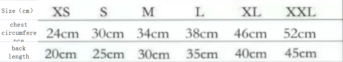 Size: XS back length 20cm, bust 30cm, S back length 25cm, bust 35cm, M back length 30cm, bust 40cm, L back length 35cm, bust 45cm, XL back length 40cm, bust 50cm, XXL back length 45cm Bust 55cm
