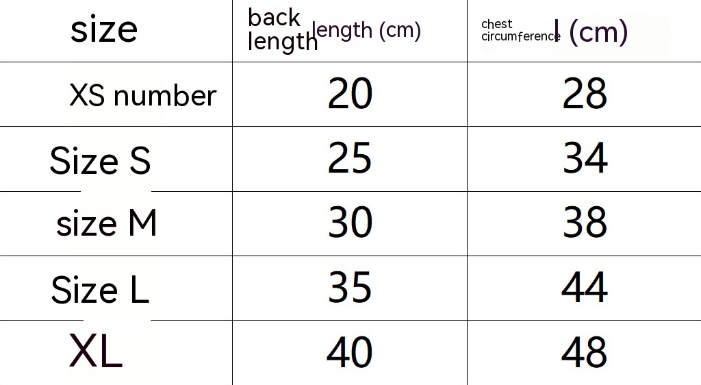 Size: XS back length 20cm (recommended 0.50kg-1.00kg,S back length 25cm (recommended 1.50kg-2.00kg,M back length 30cm (recommended 2.50kg-3.50kg,L back length 35cm (recommended 4.00kg-5.00kg,XL back length 40cm (recommended 5.50kg-9.00kg
