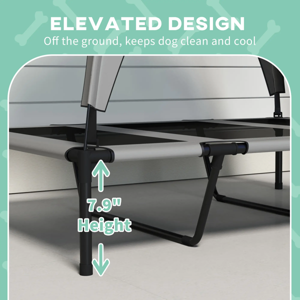 Features: - Water-repellent and UV-resistant canopy protects pets from rain and sun - Breathable mesh promotes cooling airflow for your pet's comfort - Includes travel bag for convenient portability and storage - Oxford fabric resists tearing and ensures lasting durability - Elevated design enhances airflow and prevents overheating on hot days - The steel frame supports heavy weight without bending - For large-sized dogs, less than 25.6" in body length and weighing less than 66 lbs. - Simple to put together Specification: - Color: Light Gray - Material: Oxford, Steel, Breathable Mesh, Polyester - Overall Dimensions: 41.7" L x 29.9" W x 37" H - Bed Dimensions: 41.7" L x 29.9" W - Each Breathable Mesh Dimensions: 6.3" /10.2" /6.3" L x 18.1" W - Storage Dimensions: 31.5" L x 10.2" W - Off the Ground: 7.1"