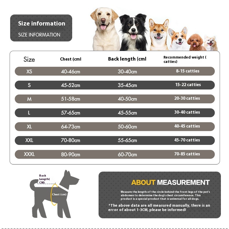 Size: XS bust 40-46 back length 30-40 recommended weight 4.00 kg-7.50 kg, S bust 45-52 back length 35-45 recommended weight 7.50 kg-11.00 kg, M bust 51-58 back length 40-50 recommended weight 10.00 kg-15.00 kg, L bust 57-65 back length 45-55 recommended weight 15.00 kg-20.00 kg, XL bust 64-73 back length 50-60 recommended weight 20.00 kg-27.50 kg, XXL bust 70-80 back length 55-65 recommended weight 27.50 kg-35.00 kg, XXL bust 80-90 back length 60-70 recommended weight 35.00 kg-42.50 kg