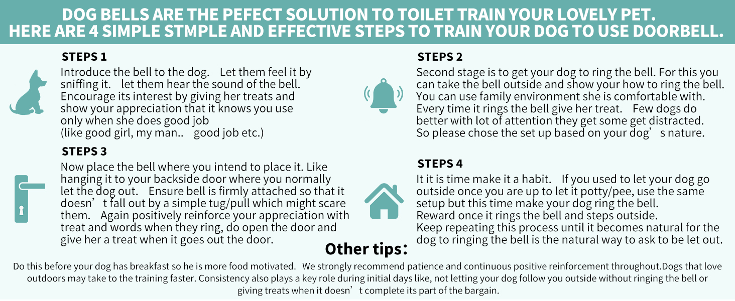 Dog Doorbells - A Way to Make Your Dog's Communication Easier and Better!! Dog Training Bells are one of the simple and non-confrontational solutions to toilet training your family's best friend. You can train them to use the toilet and teach them how to signal you when they need to use the toilet!! Using dog bells has been proven to be a way to make your dog's communication easier, fun and win-win, rather than barking.