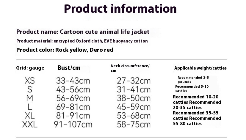 Size: XS (recommend weight 1.50kg-2.50kg, S (recommend weight 2.50kg-5.00kg, M (recommend weight 5.00kg-10.00kg, L (recommend weight 10.00 kilograms-17.50 kilograms, XL (recommend weight 17.50 kilograms-27.50 kilograms, XXL (recommend weight 27.50 kilograms-40.00 kilograms