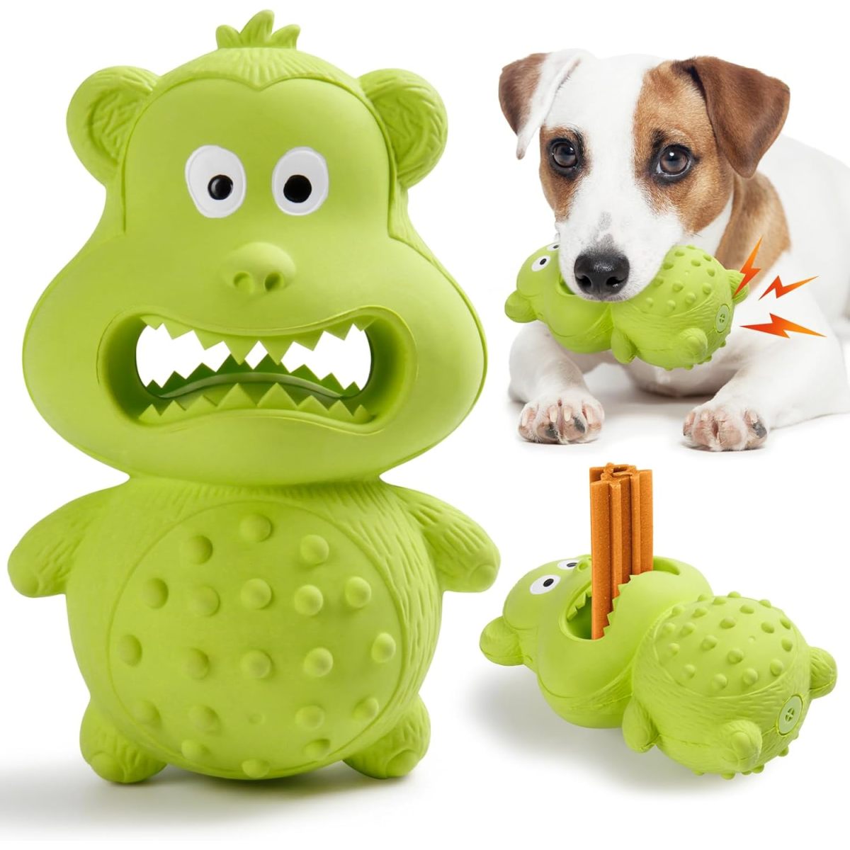 FETCH, FILLABLE& SQUEAKY DESIGN: The dog toy for aggressive chewers rubber part is 30% thicker than other toys.The dog toys for aggressive chewers unpredictable bounce makes for exciting games of fetch and other interactive play with your pet. Squeaky dog toys creates fun sounds during chewing, provide long-lasting engagement making chewing more exciting for dogs. The dog toy is even more enticing when treat filled with bits of kibble, peanut butter, Snacks or hold collagen sticks. (Dishwasher safe for easy clean up)