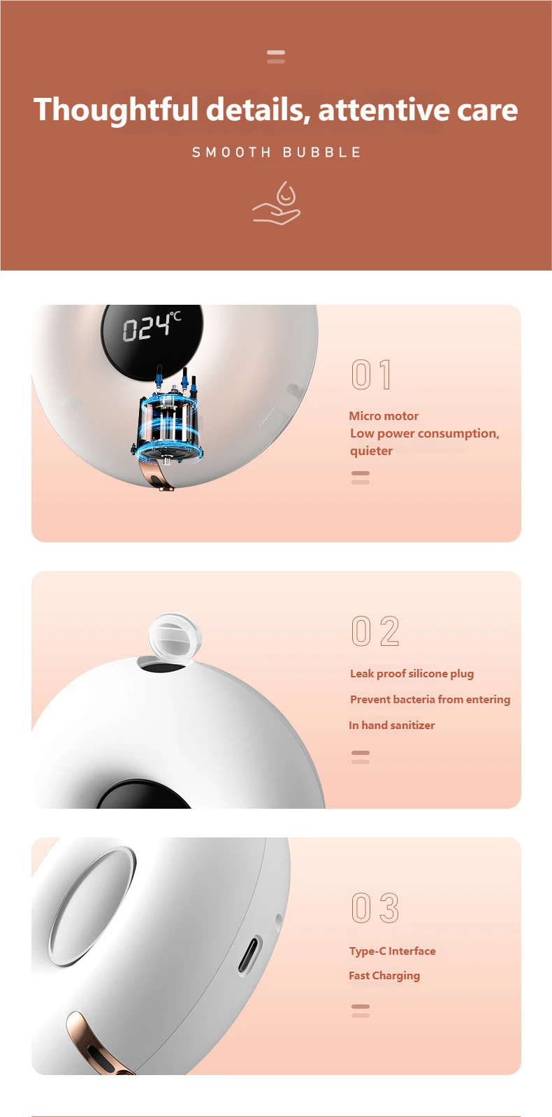 Smart Infrared Induction, Touchless & Hygienic: Equipped with high-sensitivity infrared induction technology, it dispenses foam instantly when hands are detected, eliminating the need for physical pressing. It effectively prevents cross-infection caused by traditional press-type soap dispensers and adds a sense of technology and fun to hand washing, especially suitable for children.
