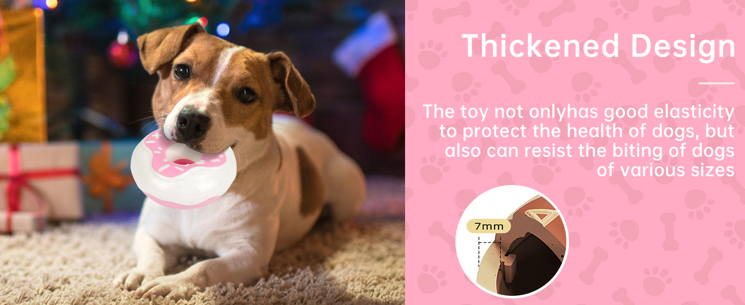 [lndoor and Outdoor lnteractive Toy] This is a donut dog chew toy that can be used both indoorsand outdoors, combining functions such as teeth grinding, squeaky making, and fetchtraining. It can help your dog pass the boring time, alleviate their anxiety andboredom, and even maintain their oral health.