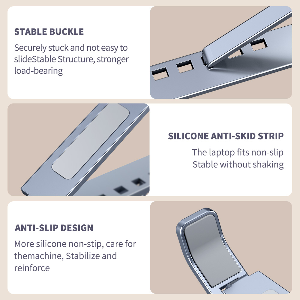 Silicone anti-skid pads are used at the bottom of the bracket and the supporting part to prevent the laptop from slipping and your computer from being damaged