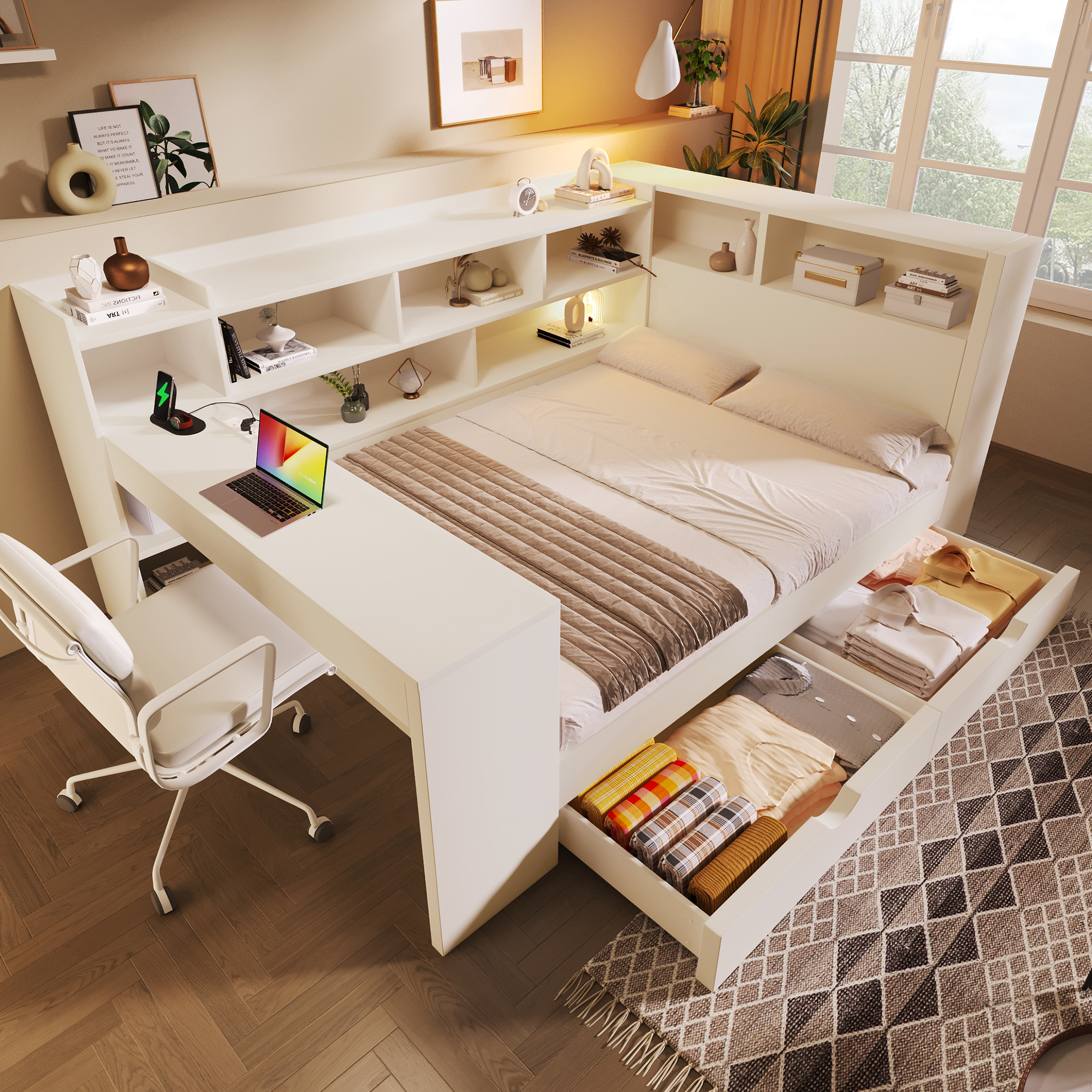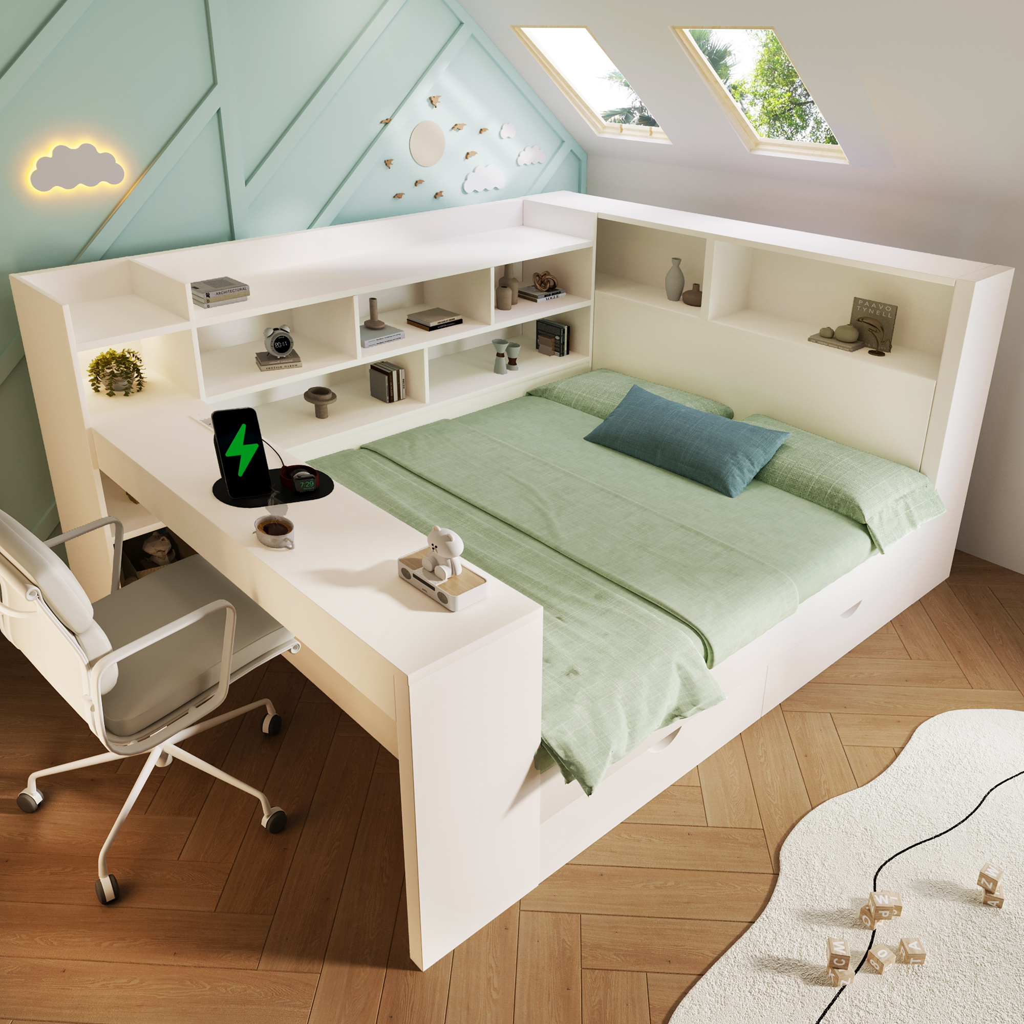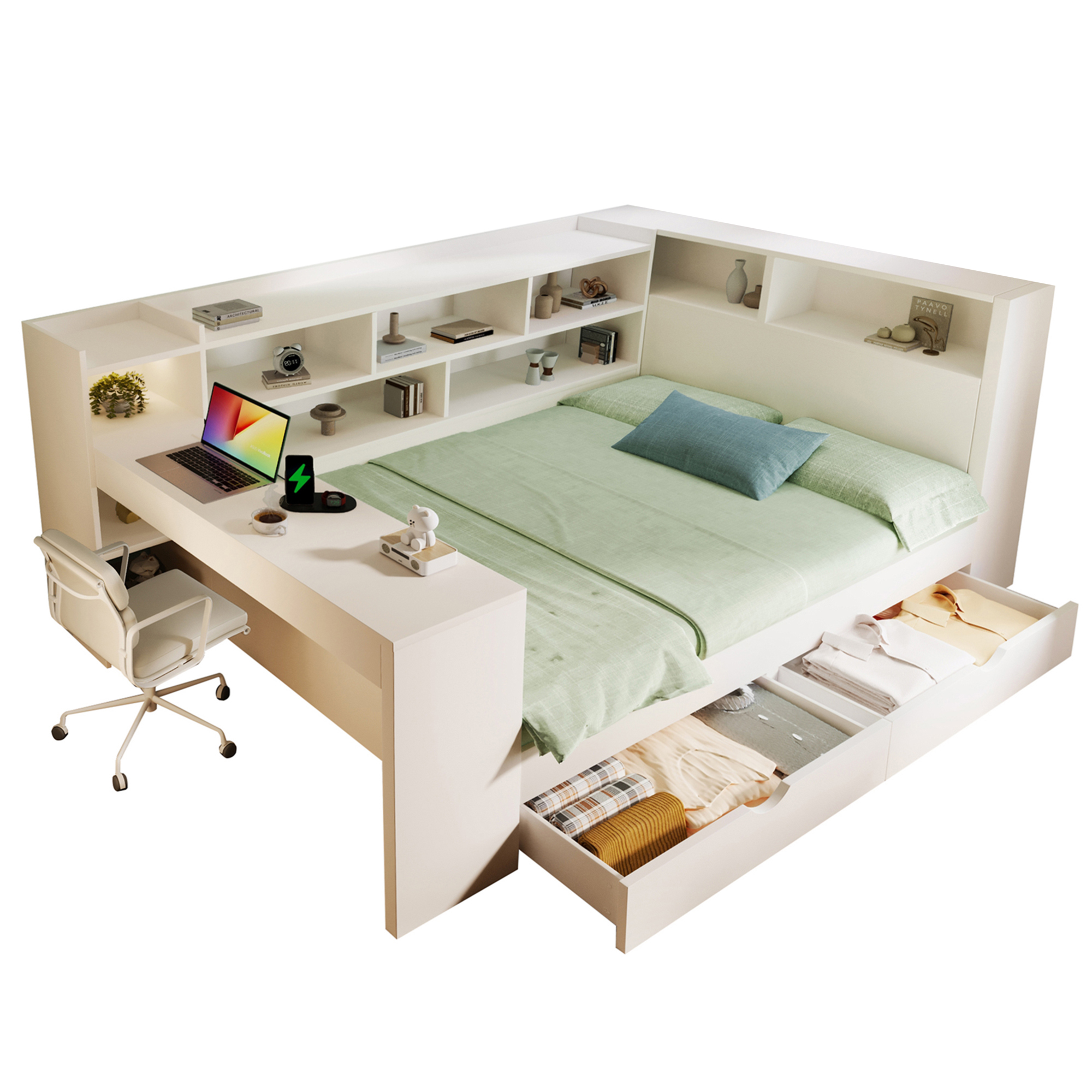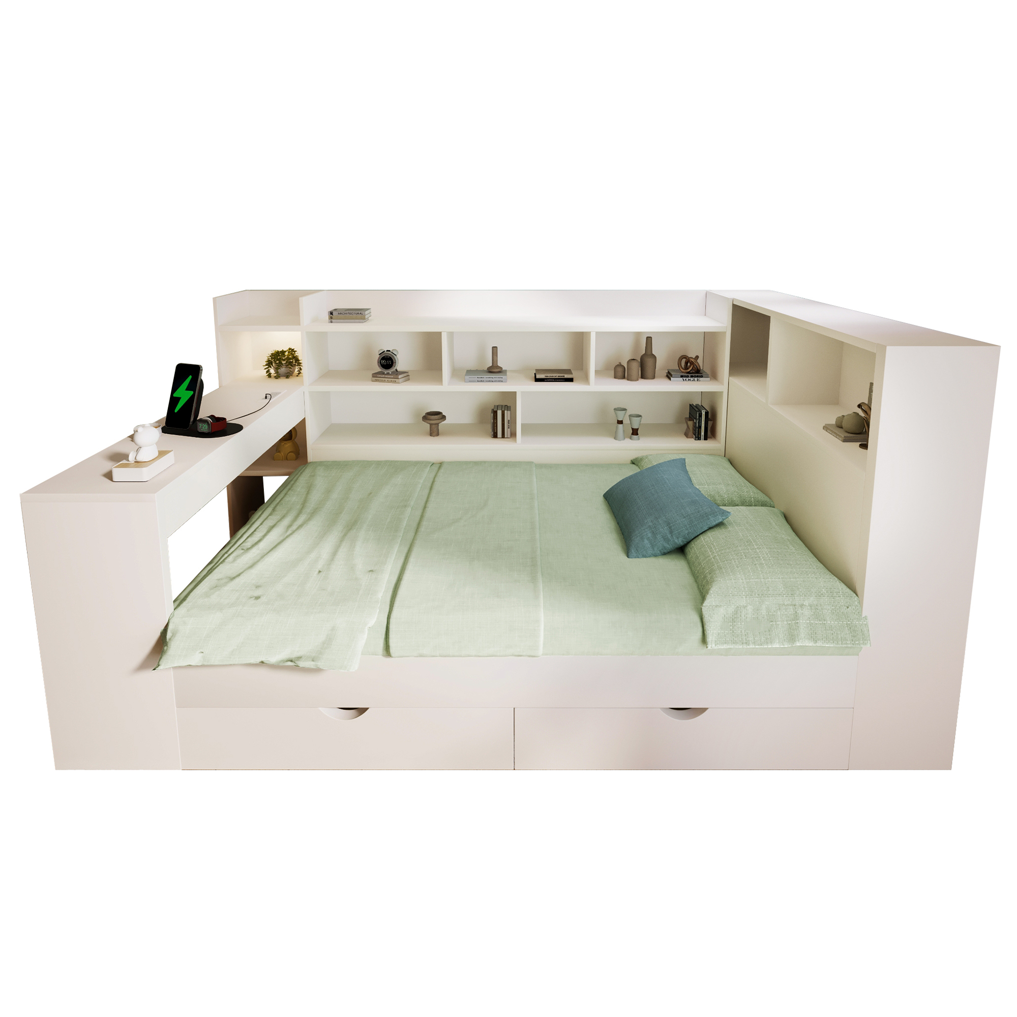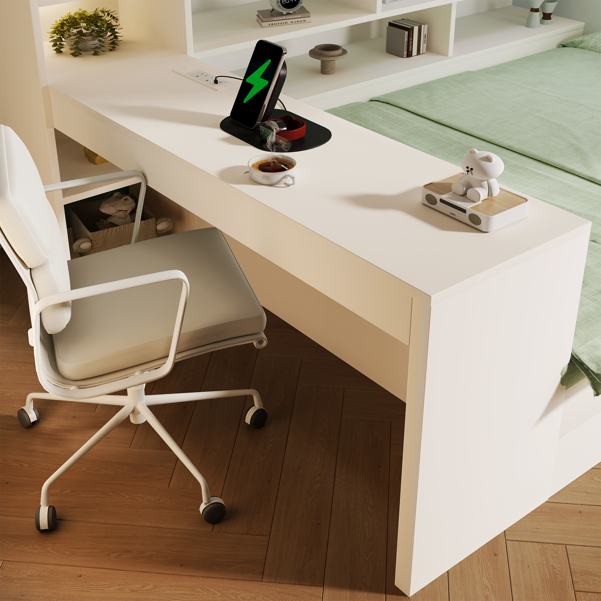 - 【Ergonomic Workspace】The integrated desk, located at the foot of the bed, is made of environmentally friendly wood. Standing 74 cm tall, it enhances comfort for working and studying. Combining a charging port, a spacious desktop, and a bookshelf on the left, it creates a tidy work environment, facilitating efficient study/work at home.
