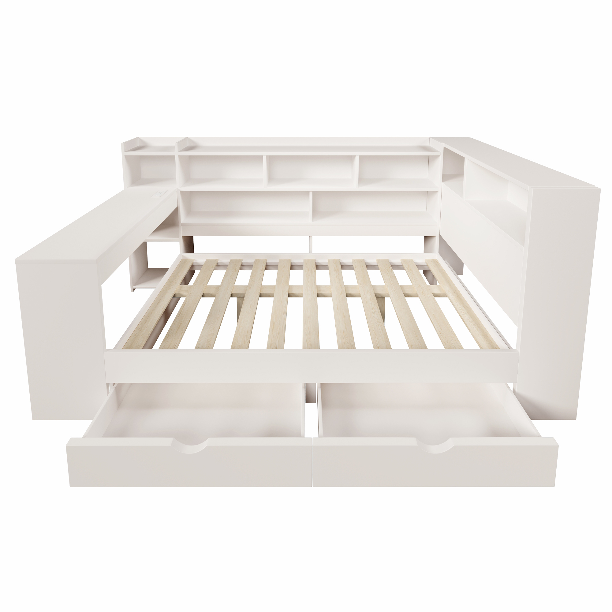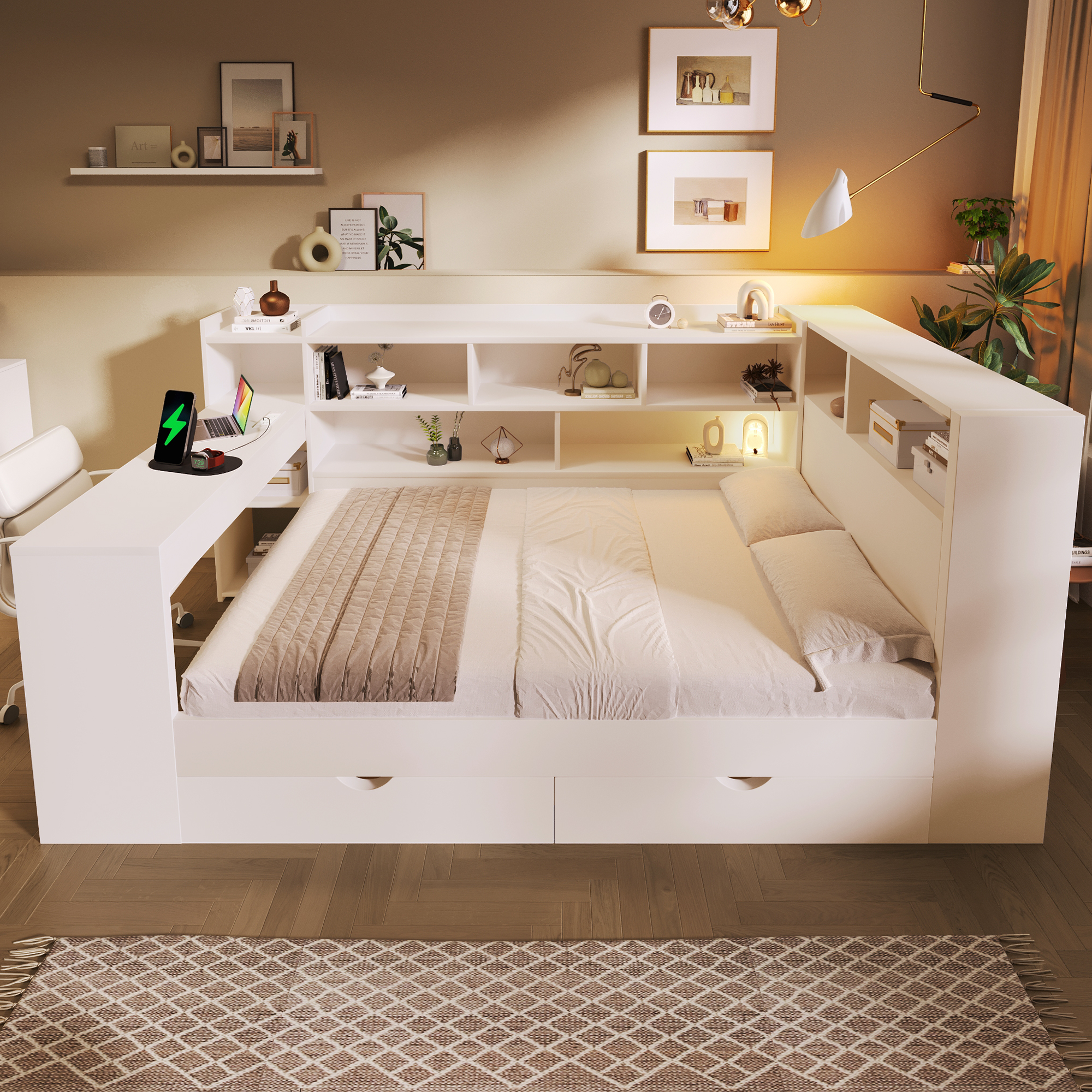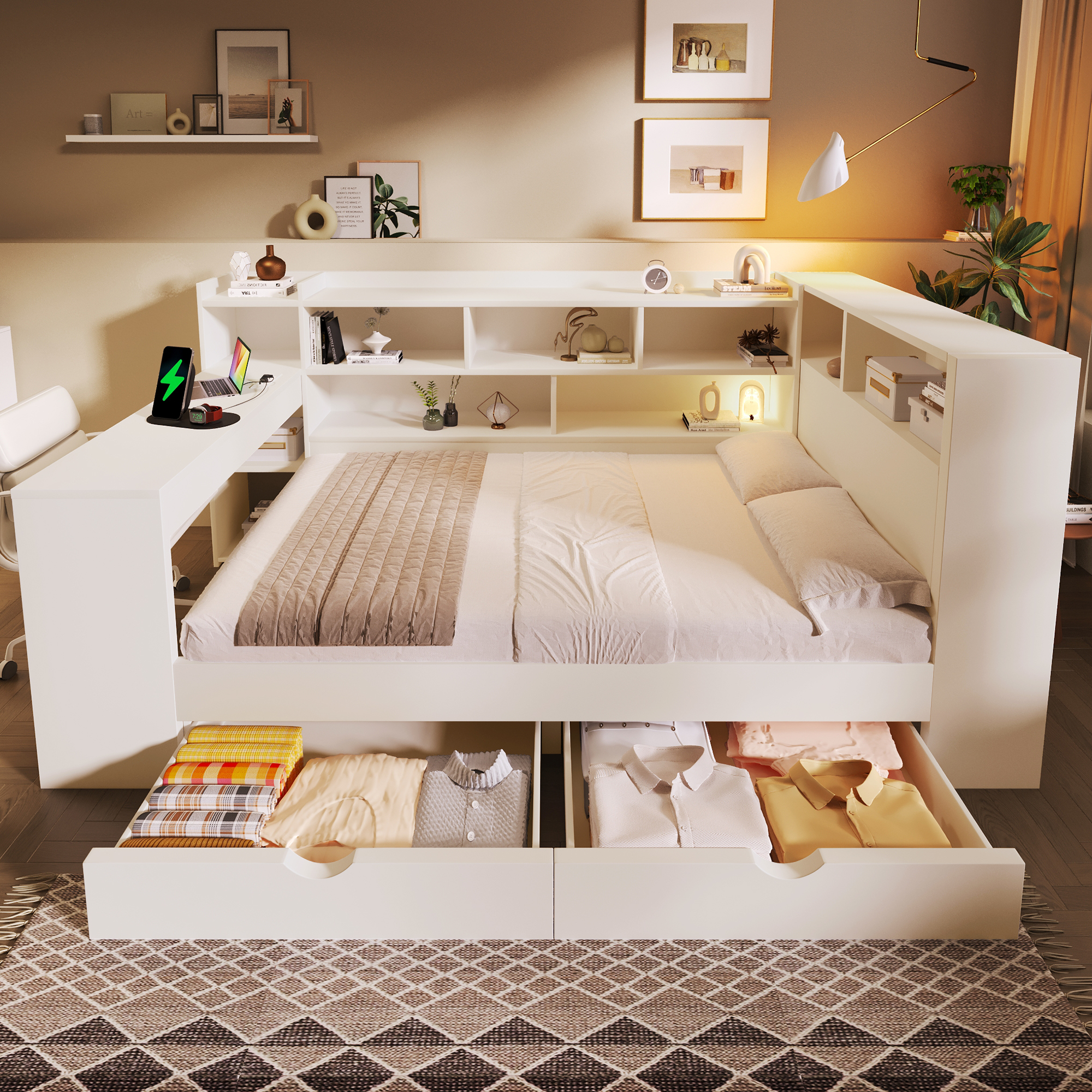 - 【Ample storage space】Open double shelves and niches along the side of the bed are perfect for displaying picture frames, crafts, or books. Shelves on the headboard can be used to conveniently place items such as cups, eyeglasses, or phones before bed. Two spacious drawers under the bed frame provide additional storage space. Each drawer has four wheels for easy sliding from the right side.