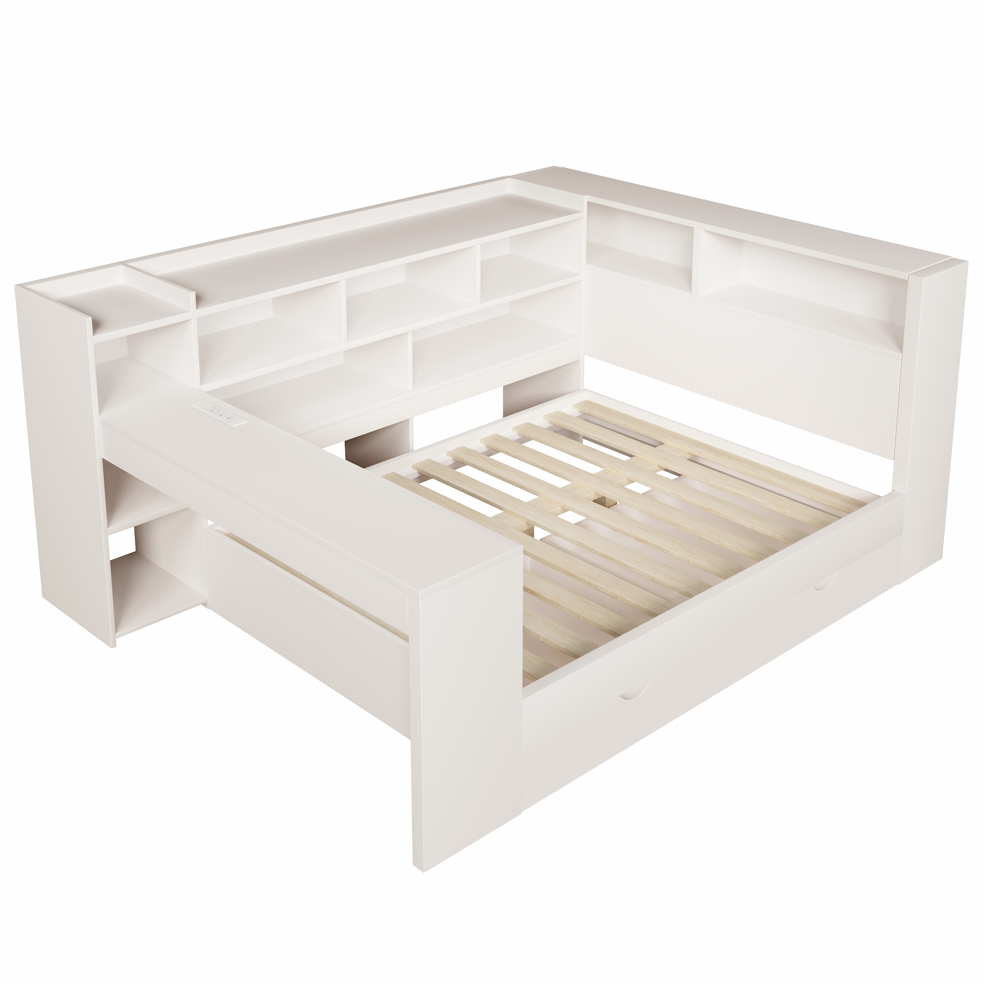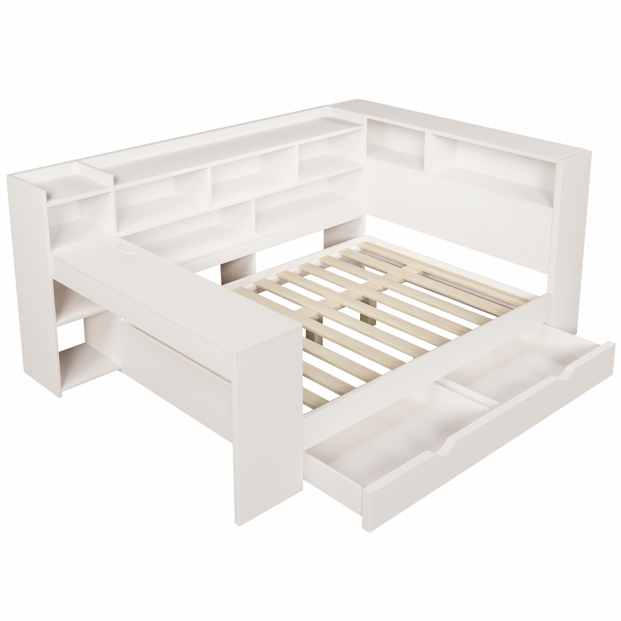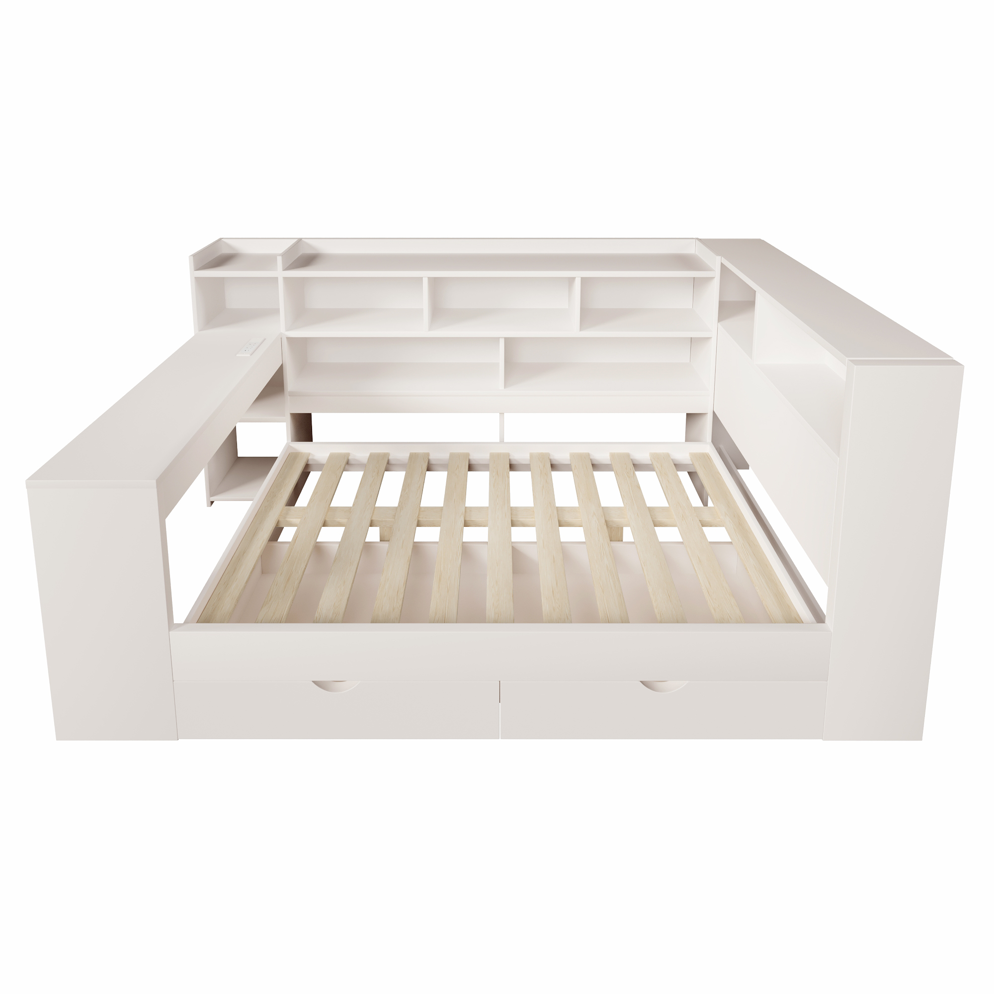 Product Name:Double Daybed with Bookcase & Computer Desk, 4ft6 Sofa Bed with Storage, Drawers & USB Type-C Port, 135 x 190 cm Multi-functional Wooden Bed Frame for Living Room/ Bedroom, White (No Mattress)