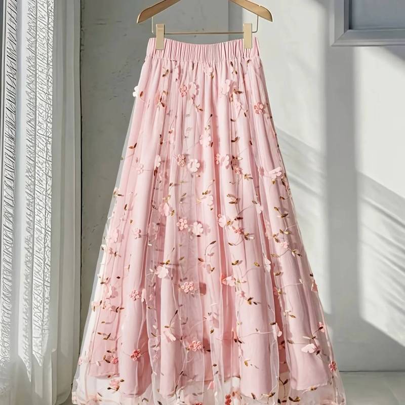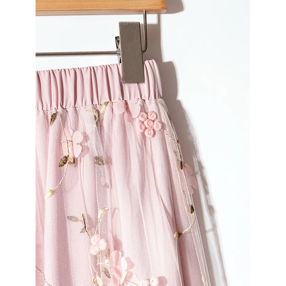 Double-layer Mesh Skirt With A Flared Hem And 3D Floral Design