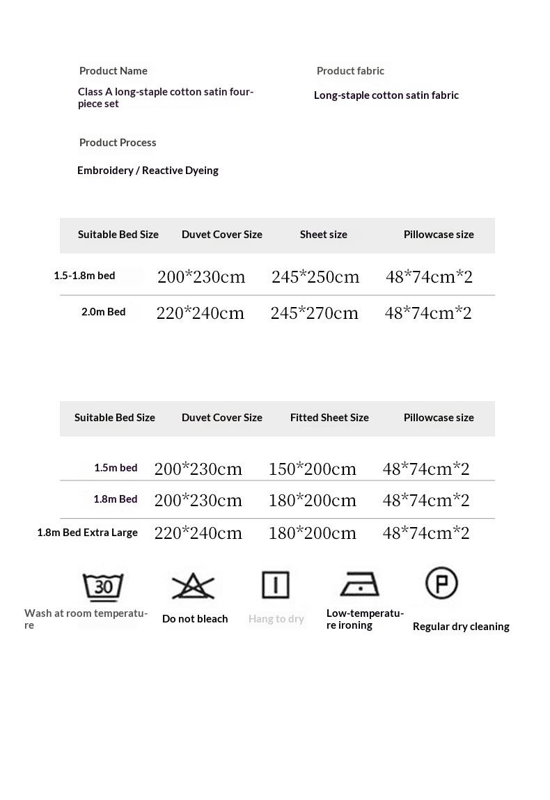 Size specifications: four-piece 1.5m bed sheet, four-piece 1.8m bed sheet, four-piece 2.0m bed sheet,