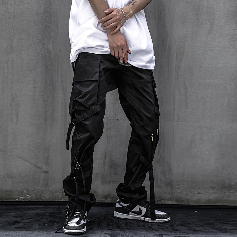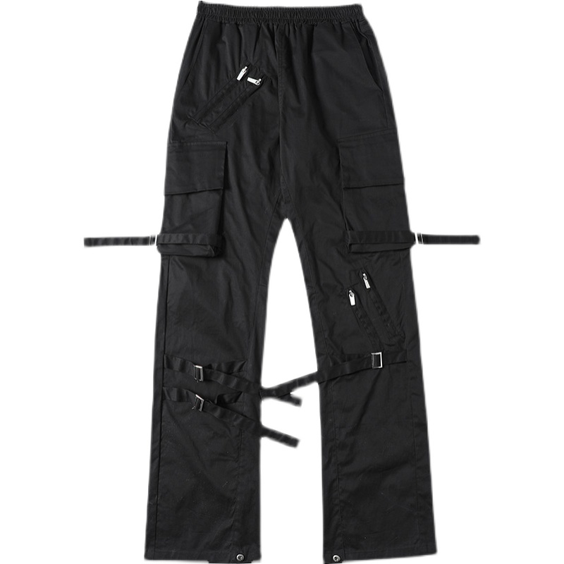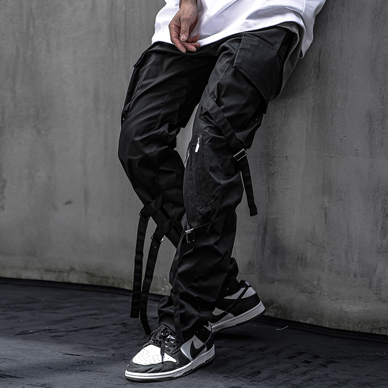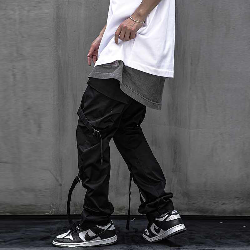 Jiye heavy industry country trend line pants legs double webbing pants men's casual black all-match overalls personality streamer trousers