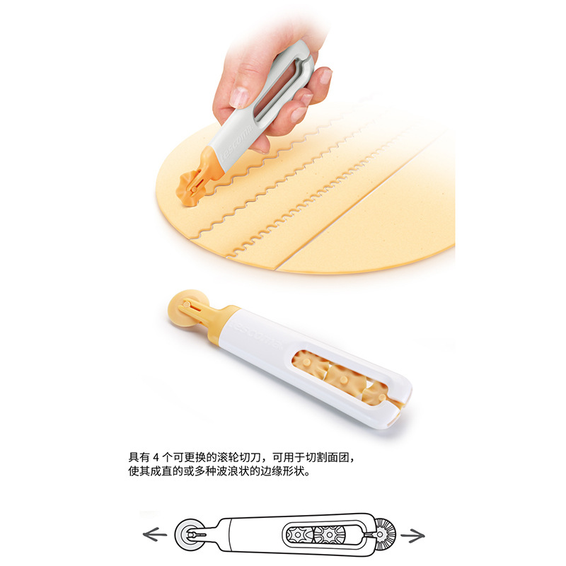 Uses: With 4 replaceable roller cutters, it can be used to cut dough into straight or multiple wavy edge shapes, and also for cutting pizza.