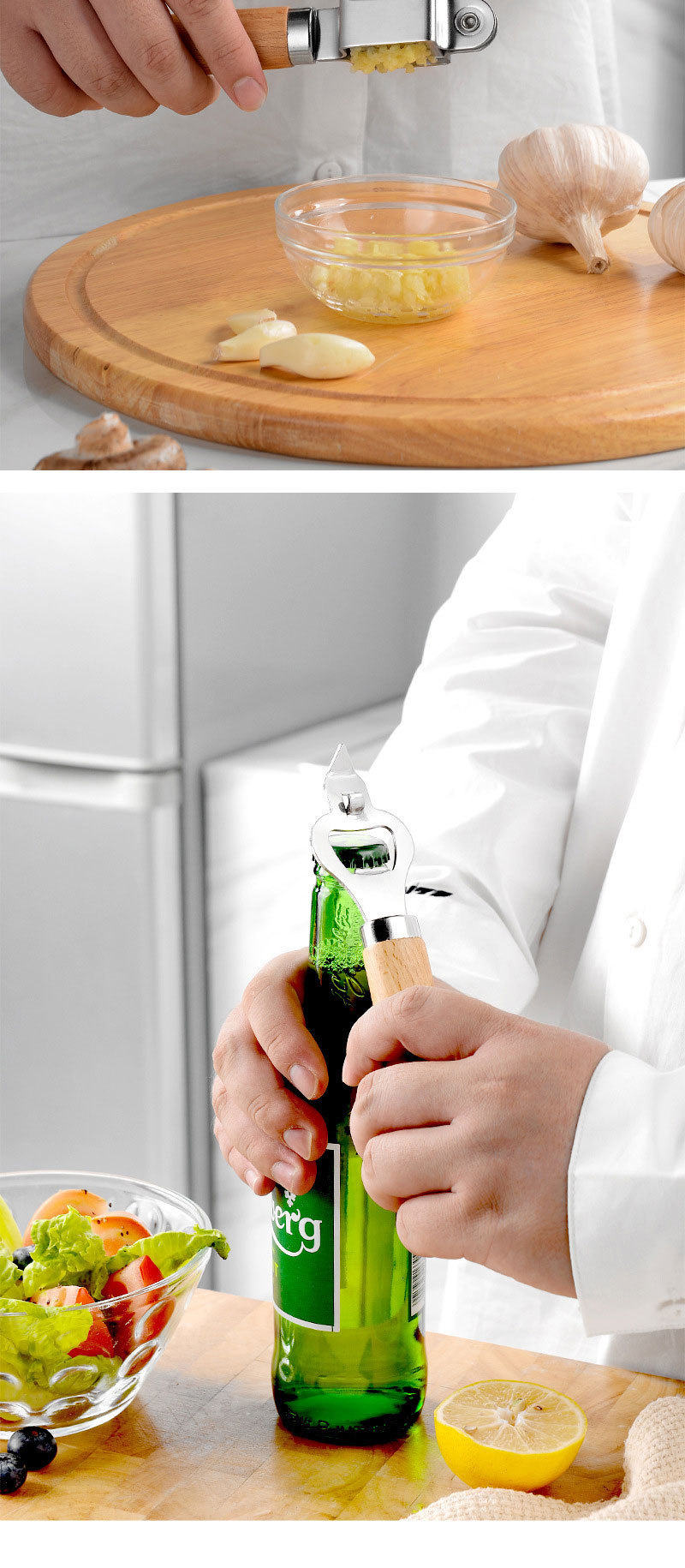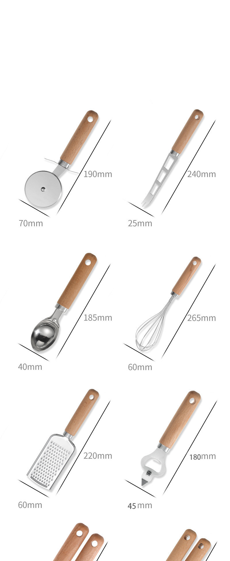 Specifications: A9 piece set (color box), B can opener, C garlic press, D cheese knife, E cheese cutter, F bottle opener, G ball digger, H cake wheel, I fruit cutter, J hit Egg container