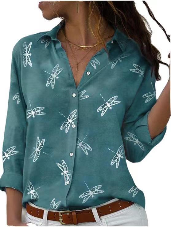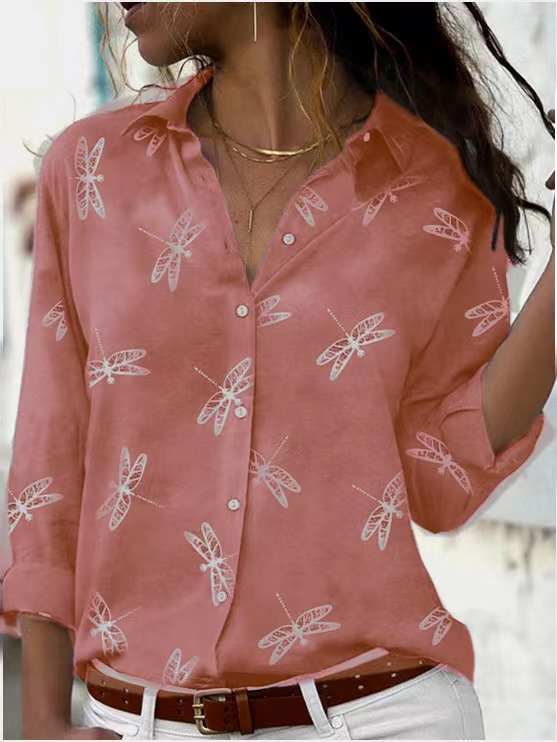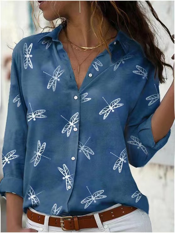Dragonfly Printed Long Sleeve Lapel Slim Fit
