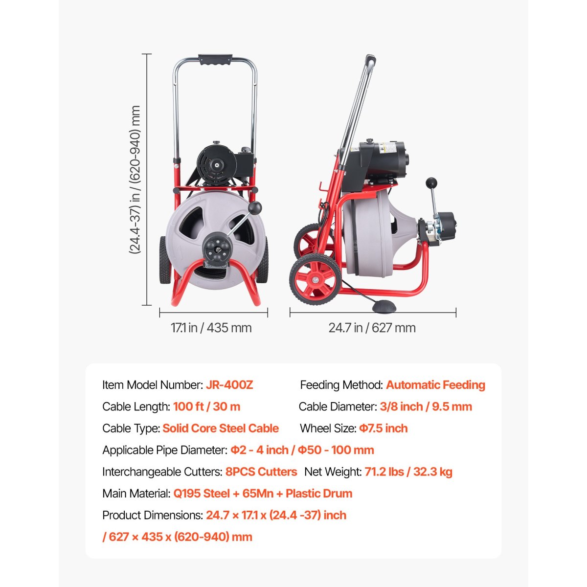 Movable and Space-Saving: Take it anywhere, store it with ease! This drain cleaning machine is equipped with 7.5-inch wheels for effortless movement. And the telescopic handle provides more ergonomic use and makes transport and storage easier