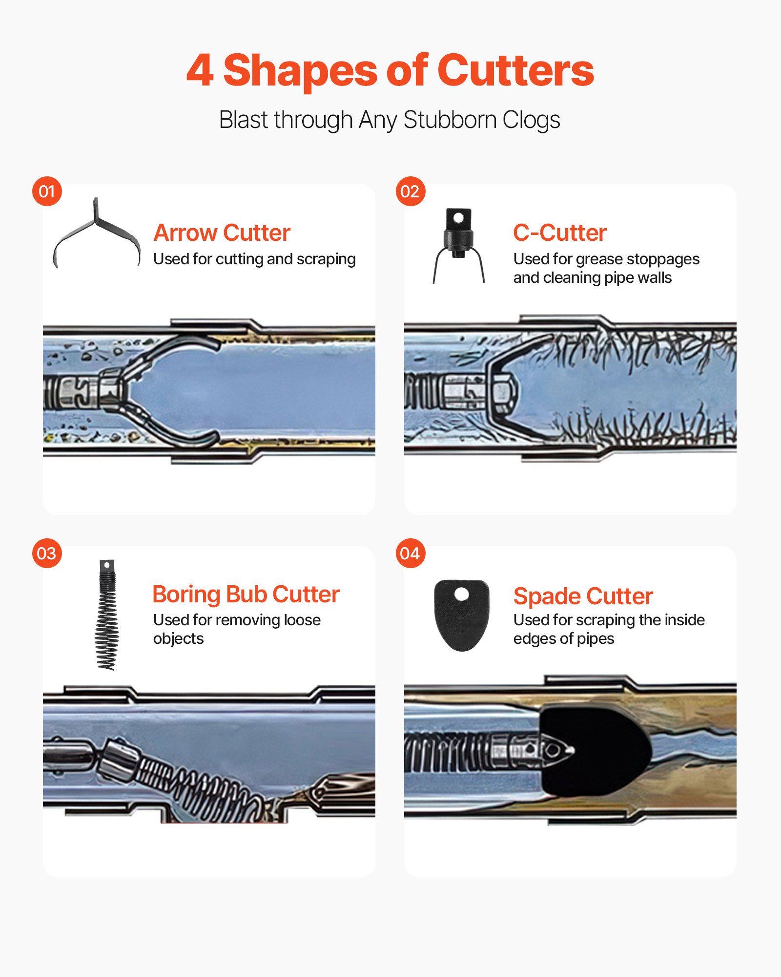 Interchangeable Cutters: Equipped with 4 cutter heads to target different types of blockages. Our electric sewer auger is ideal for clearing clogs in sewer pipes, sinks and toilets, helping simplify troublesome maintenance and eliminate unpleasant odors