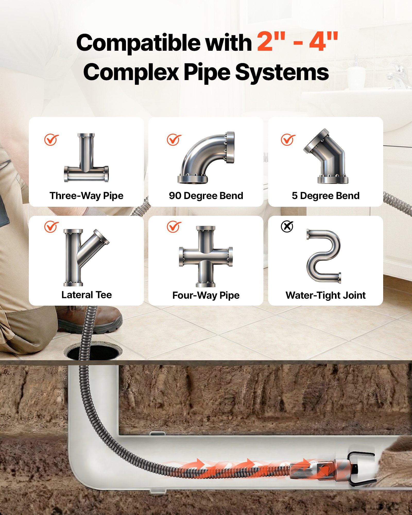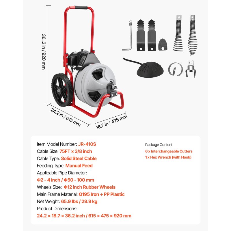 Efficient Clog Clearing: VEVOR drain cleaner machine adopts a manual feeding system, and the cable needs to be manually pushed into and pulled out of the pipe. Paired with the 1700 RPM high-speed motor, it delivers efficient rotation to clear blockages more effectively