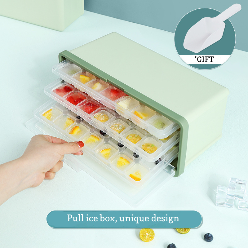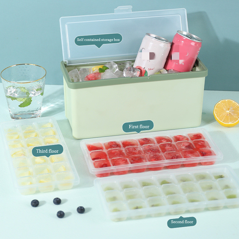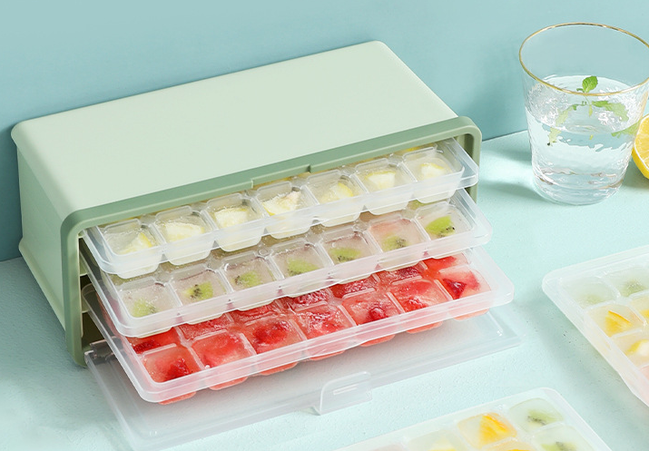 After the three ice trays are stacked, they are placed in the box body, and an ice shovel is placed at the same time.