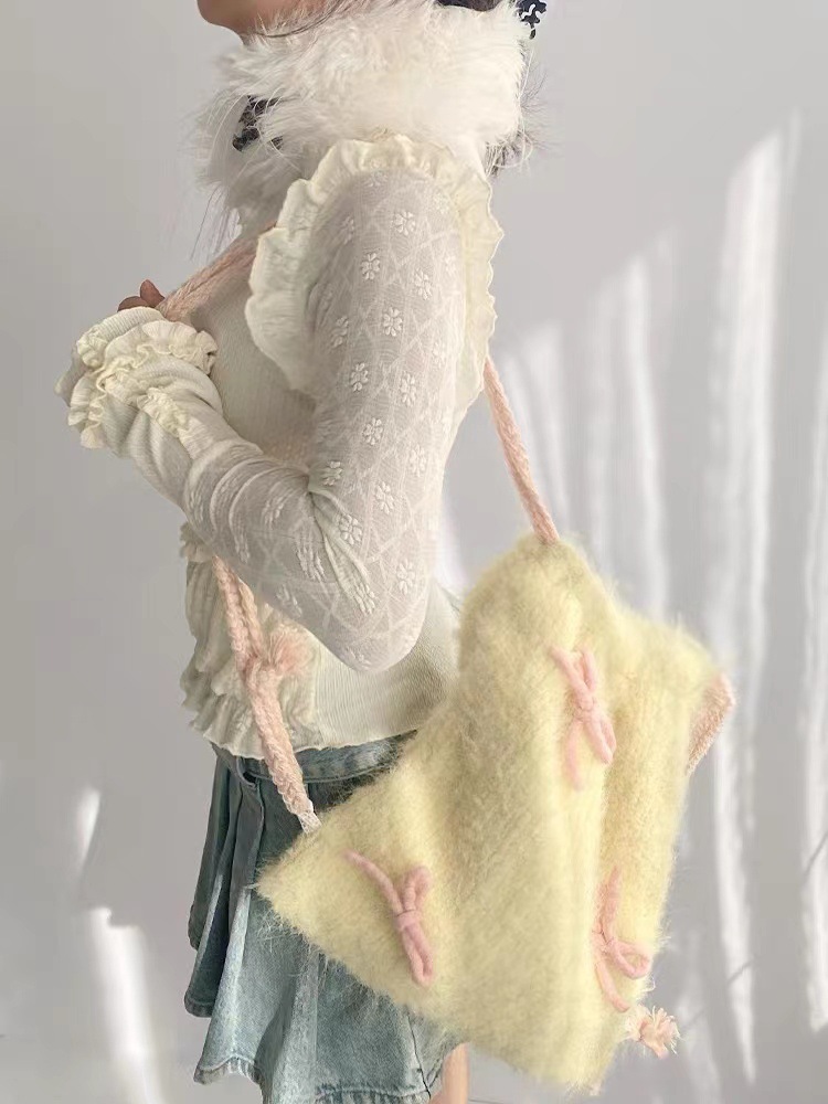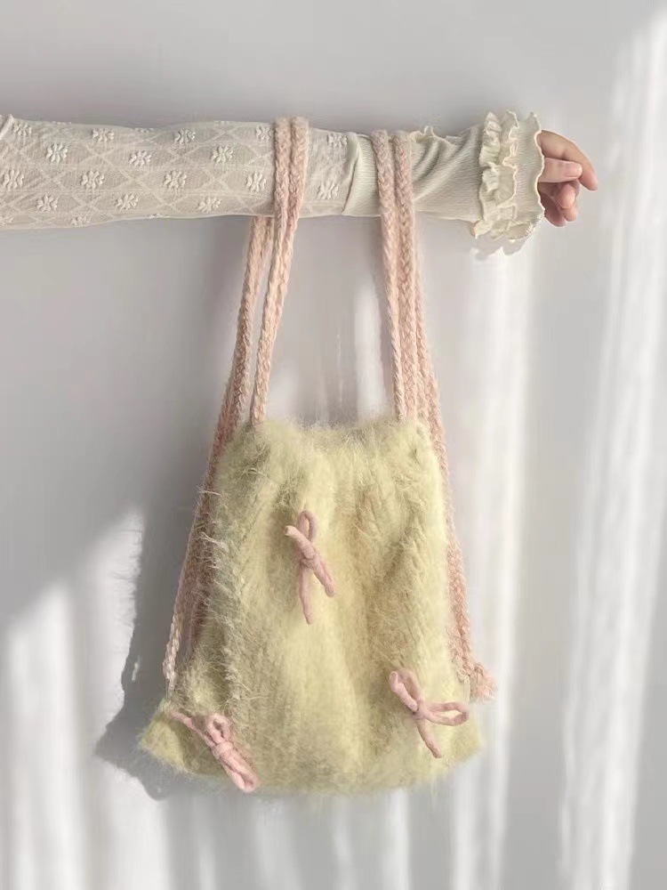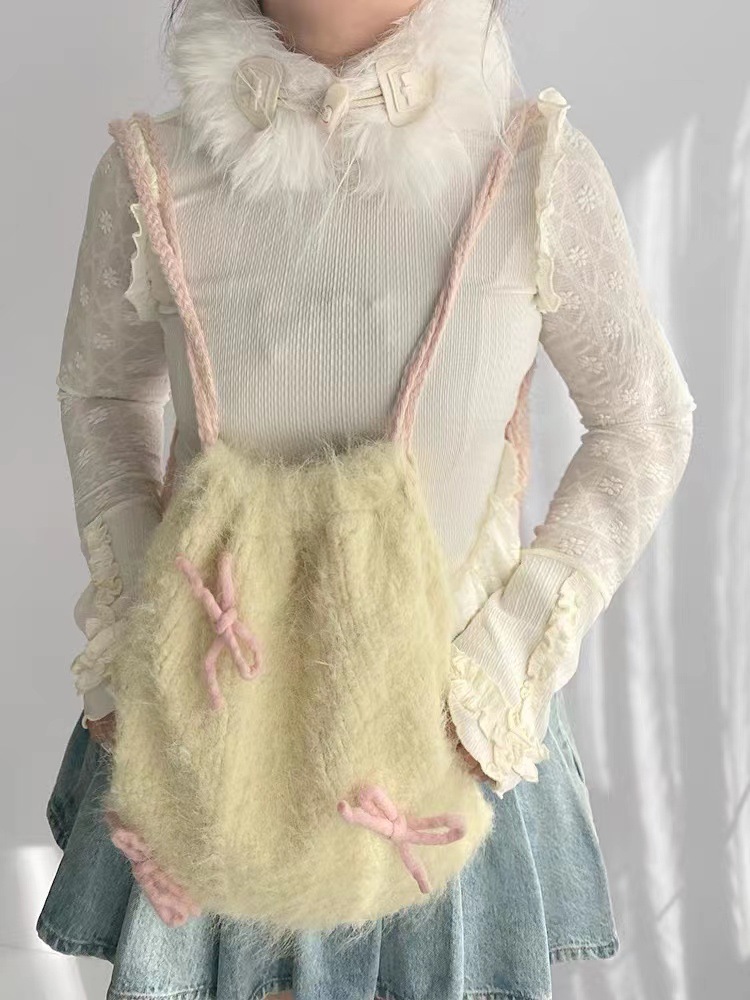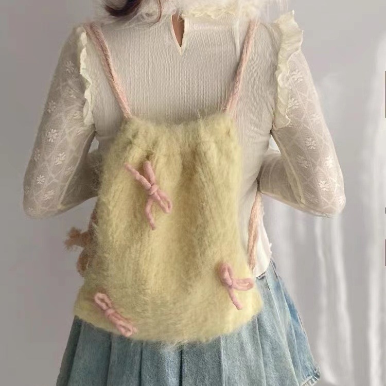 Drawstring Backpack Bowknot Furry Cloth Bag Tender Yellow Ladies