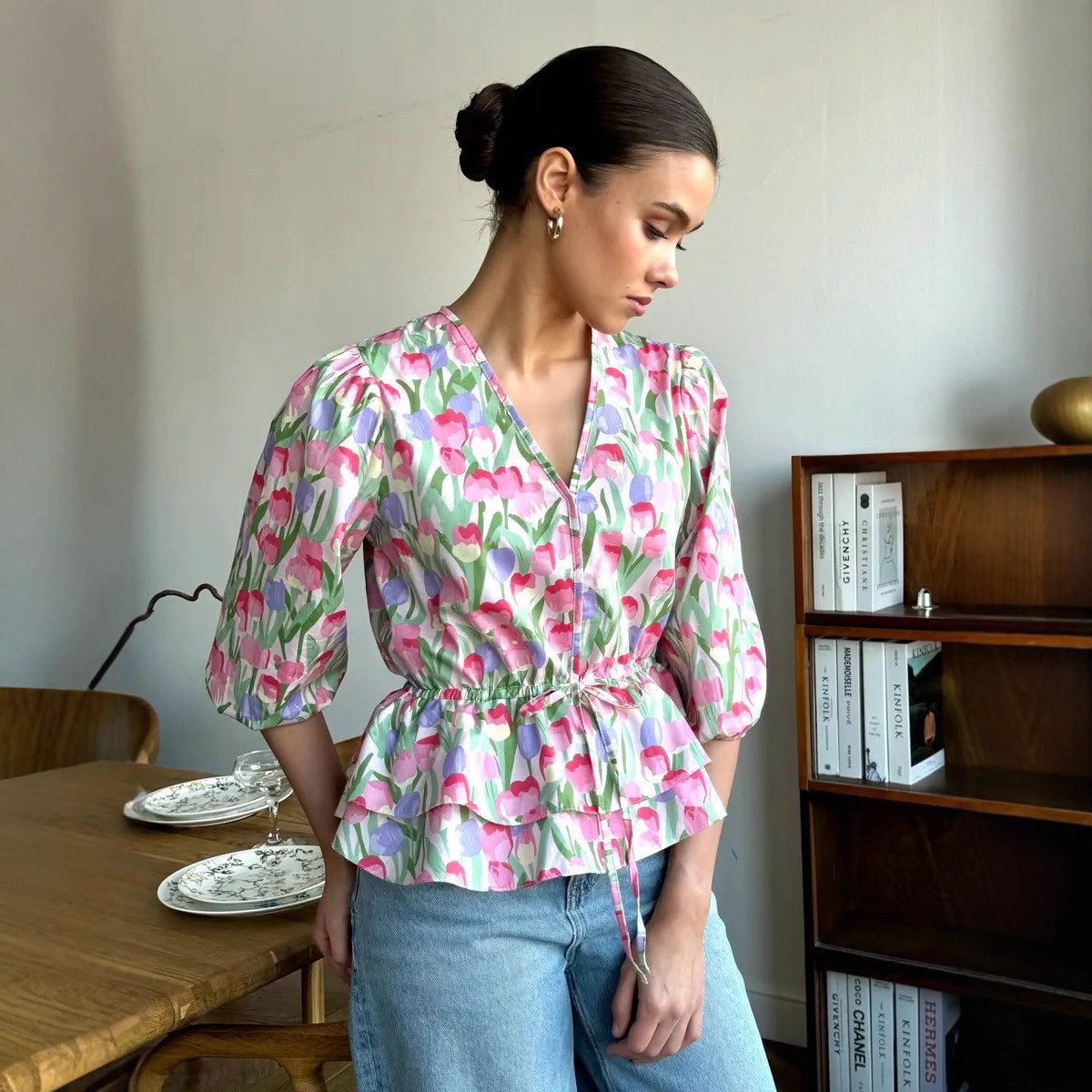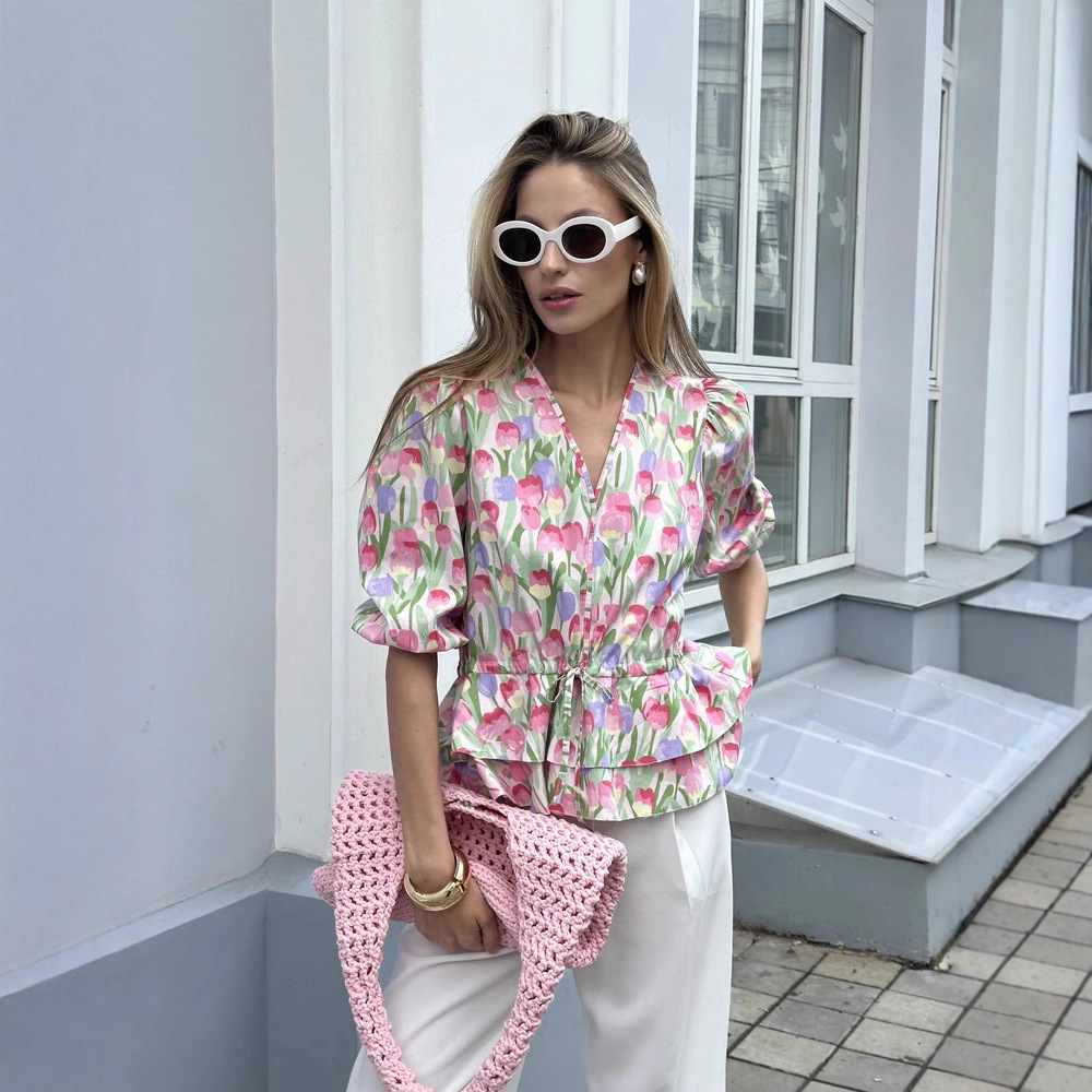 Trendy Elements: V-neck, Floral Pattern, Printed Design