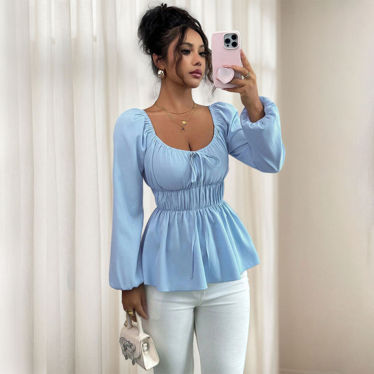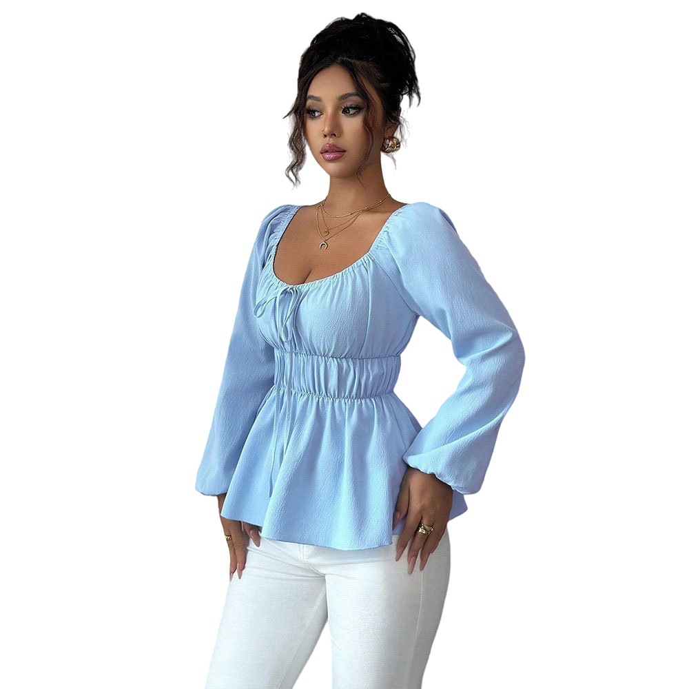 Drawstring Slim-fit Short Long-sleeve Blouse With Ruffled Hem Design For Women