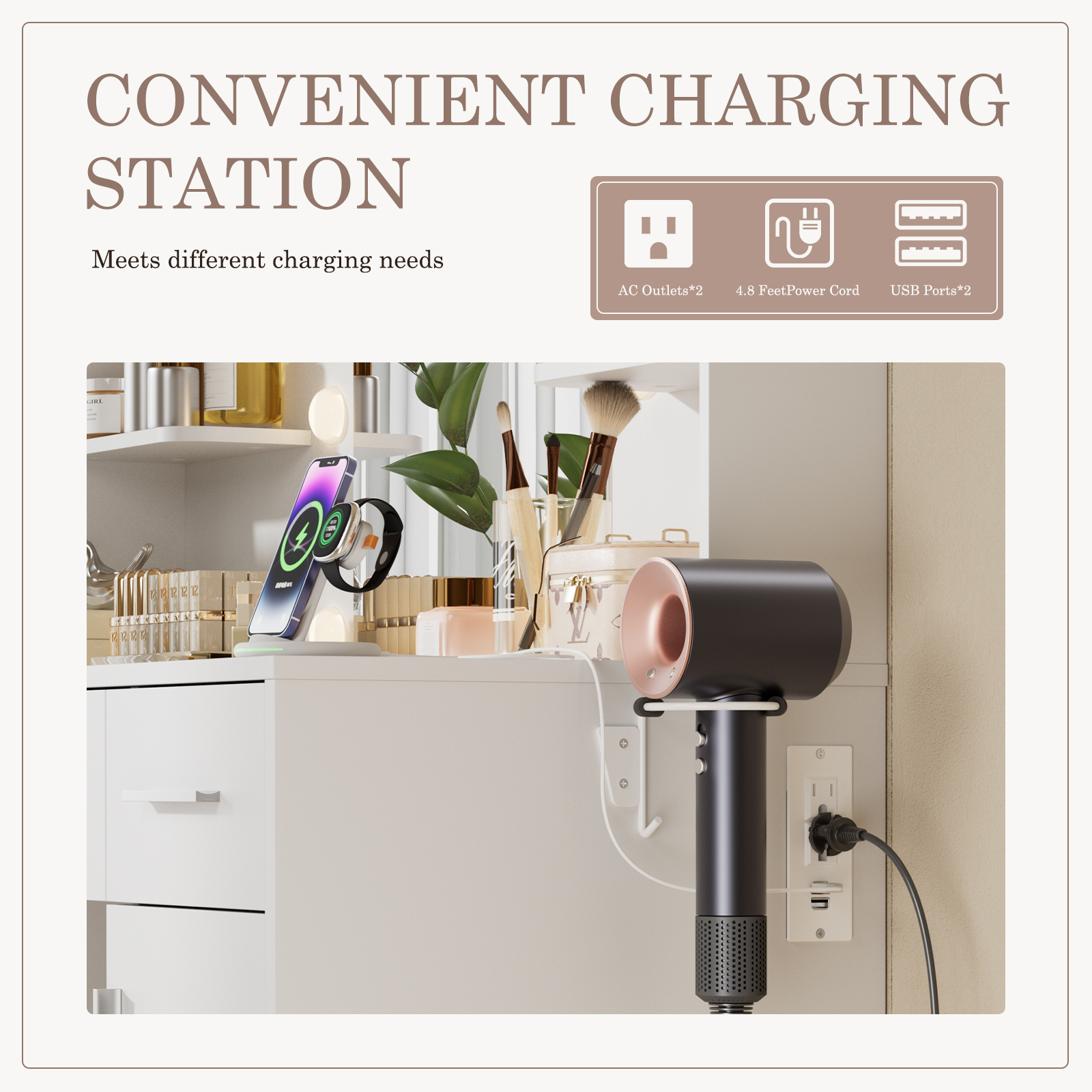 【 Power Outlet & Hair Dryer Rack 】With 2 AC outlets, 2 USB ports, and a hair dryer rack, this makeup vanity table helps you easily access your hair dryer, cell phone, curling iron, and can also provide power for your mobile phone, tablet or other devices. You can do everything at the vanity without having to walk around