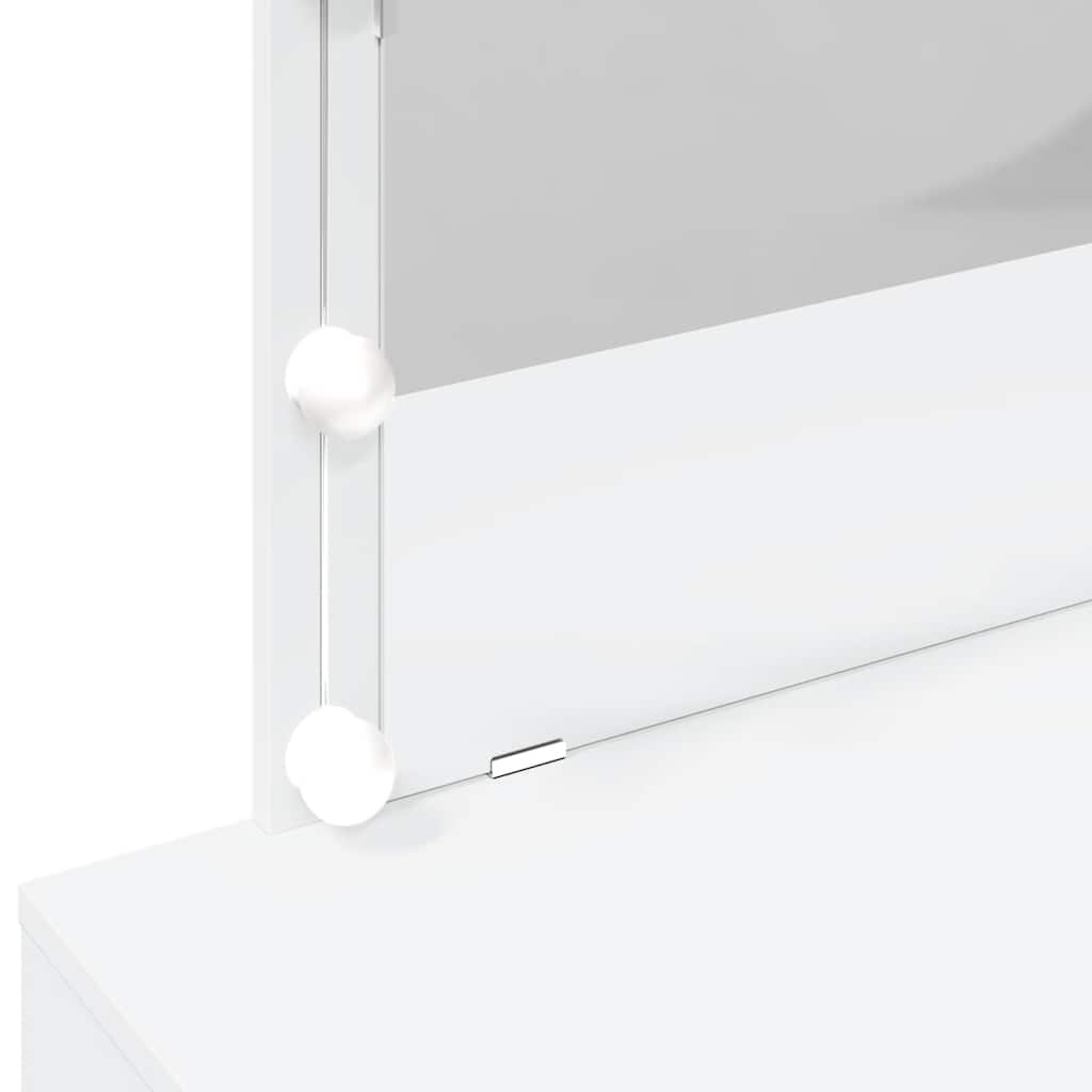 Description: This vanity table is a great addition to your bedroom and also offers convenient storage for your cosmetics! The LED lights around the mirror provide optimal illumination for your face. Caution: To prevent tipping, this product should be secured to the wall using the included wall bracket. Check out this stylish and modern vanity table with LED lighting. It brings both style and functionality to your bedroom. With clean lines and a minimalist design, it complements your decor chicly and offers practical storage space and warm light. Materials: The vanity table is made of sturdy engineered wood, ensuring it will still look great for years to come. The drawer system is easy to use, so you can quickly find what you need. Recommended use: Especially suitable for bedrooms. This vanity table is all about practicality and style. It's perfect for those who appreciate organization without sacrificing elegance. Its modern design complements many interior styles, whether contemporary or traditional. Care and maintenance: Keep it clean by simply wiping it with a damp cloth. This way your vanity table stays fresh and looks great, without much effort. Properties: