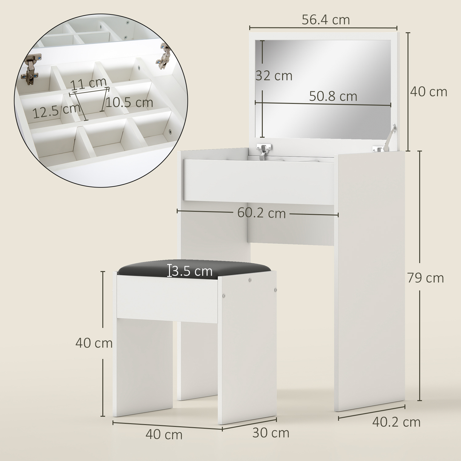 Dressing Table With Mirror And Stool, Vanity Makeup Table With Flip Up Mirror, Vanity Desk With Storage Unit And Padded Seat, White