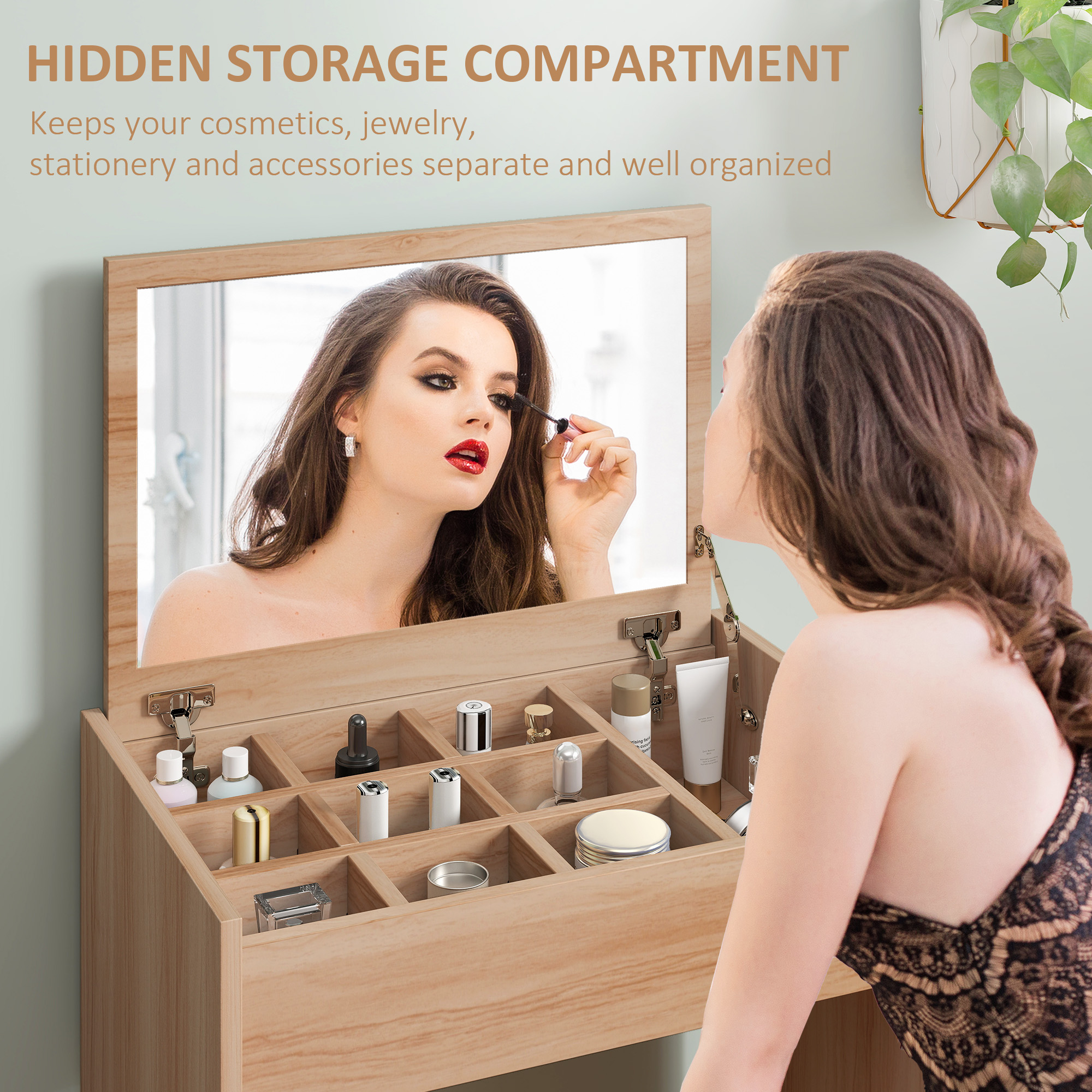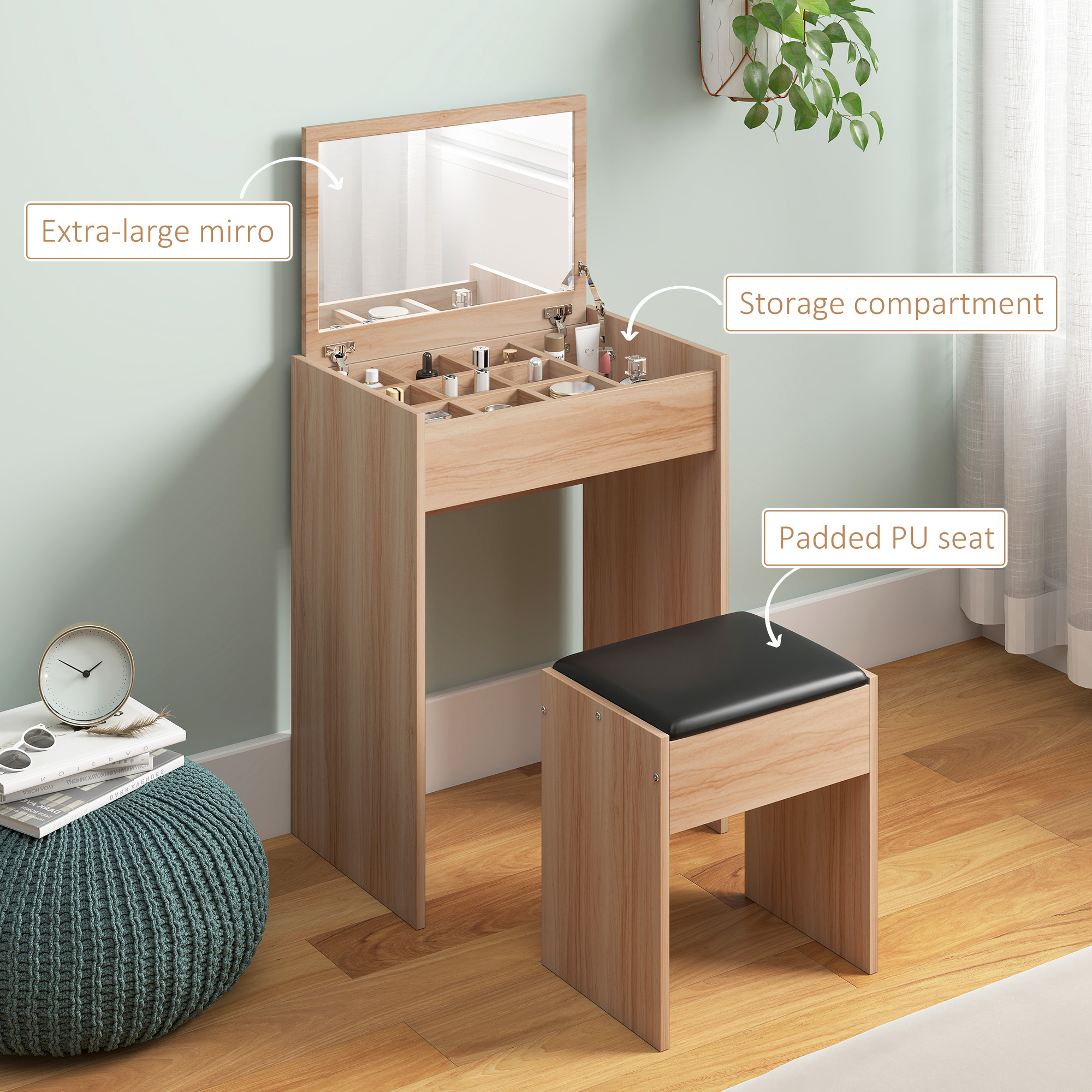 Stylish dressing table set from comes with a multi-purpose dressing table and a padded stool. The flip-up design allows you to easily convert the dressing table with a mirror to an ideal writing desk with hidden storage space under the lid. The removable space divider enables you to organise your items neatly in place. Smooth leather and soft sponge, the padded stool provides added comfort. Constructed with 16 mm-thick E1 chipboard, the table set features easy-to-clean veneer and ensures long-lasting use.