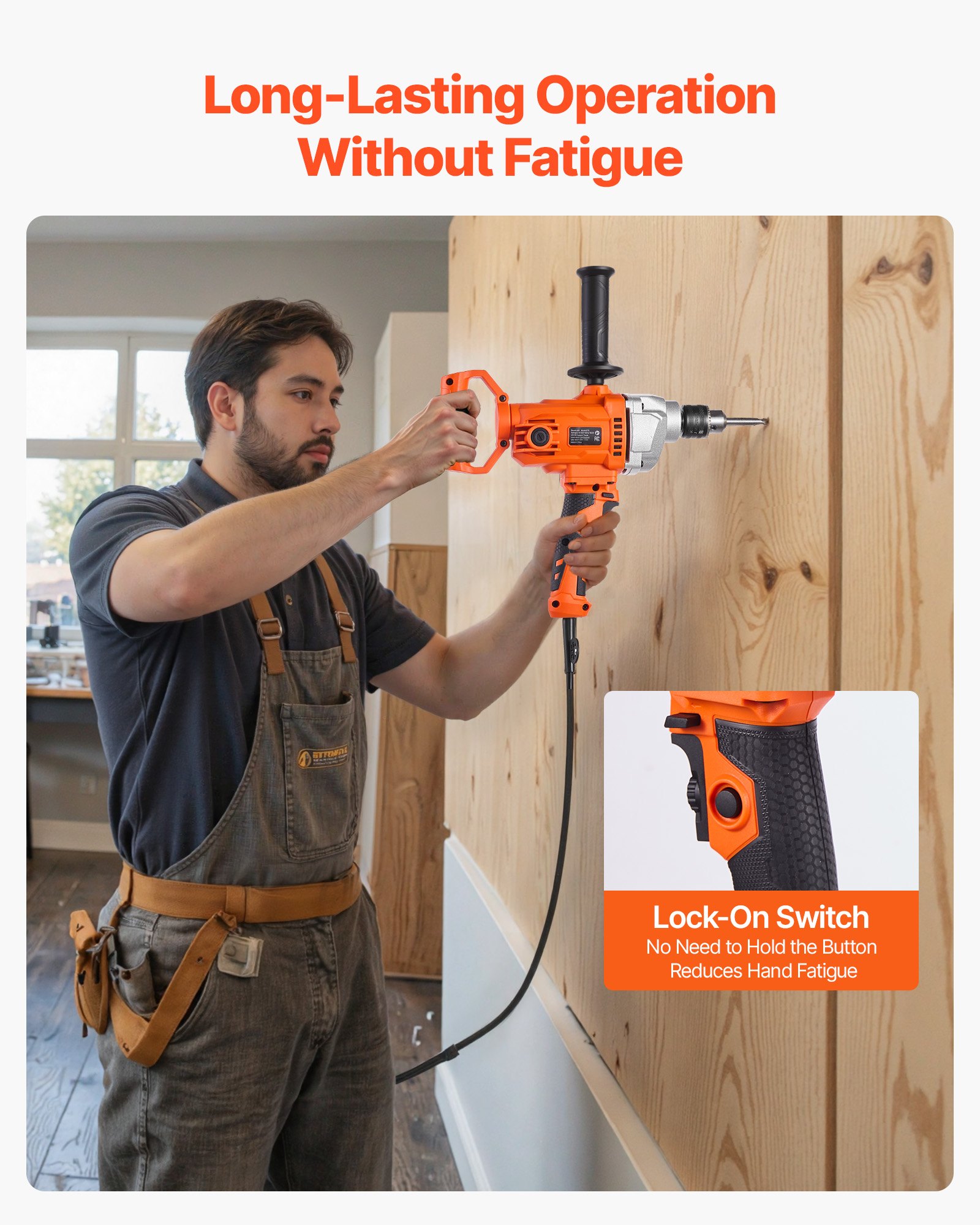 User-Friendly Details: Built for ease, VEVOR handheld cement mixer includes a rotating rear handle, anti-vibration rubber grip, and a lock-on button. The extra-long 16.4 ft / 5m cord gives you more range to move freely across your workspace
