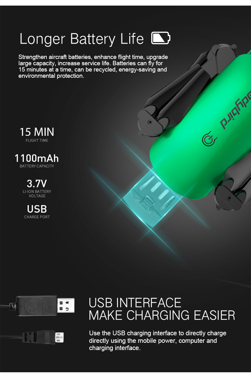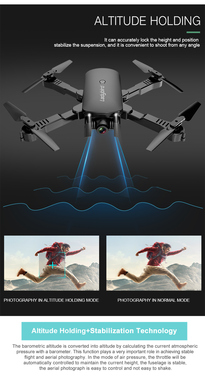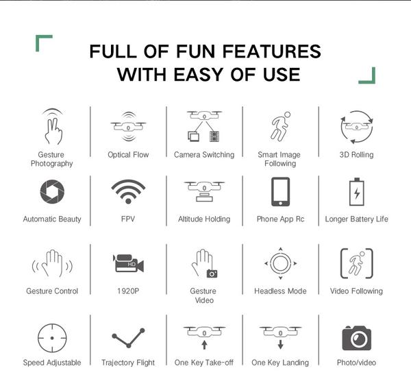 Product features: one-button take-off / landing, speed three-speed, 360-degree roll, headless mode, one-button return, emergency stop, optical flow positioning, real-time aerial camera dual camera 720P/1080P/4K/ configuration dual lens synchronization, editing music, Gestures, video, beauty, trajectory, smart follow, gesture control...