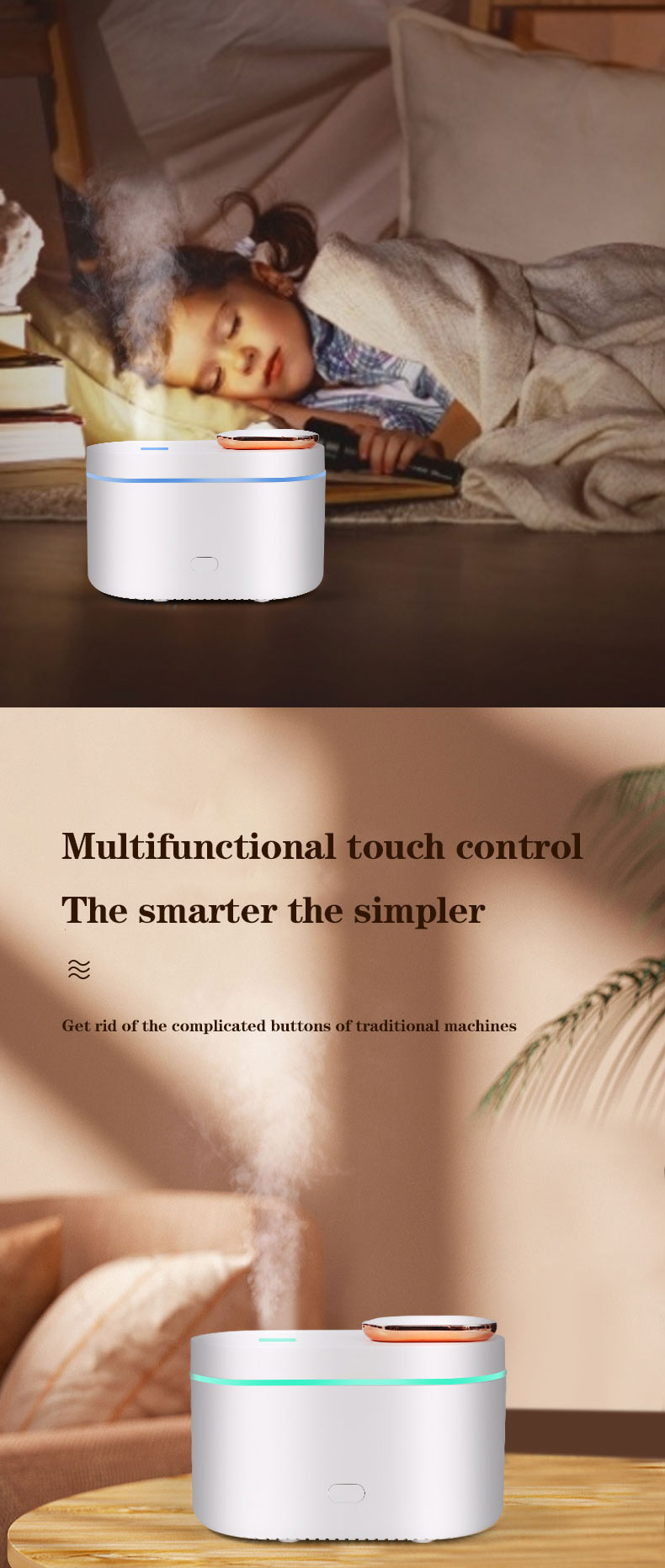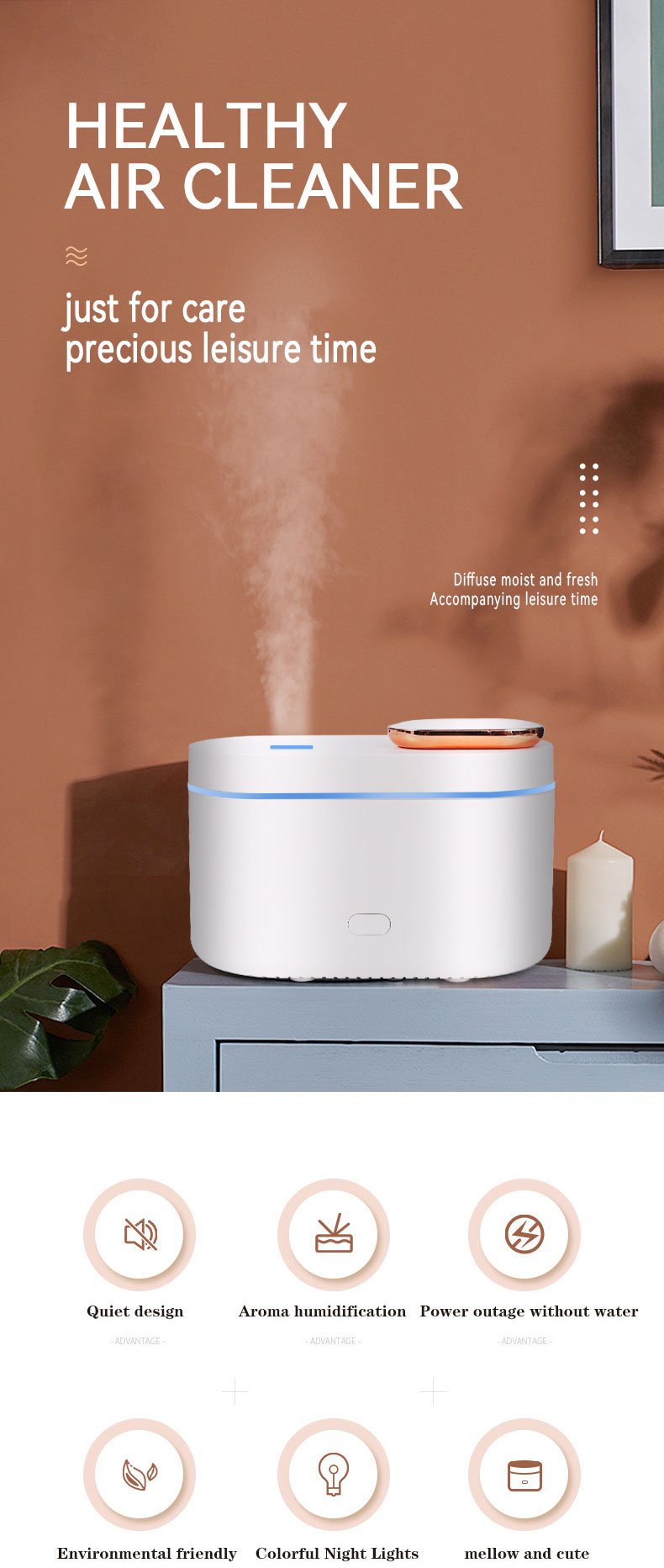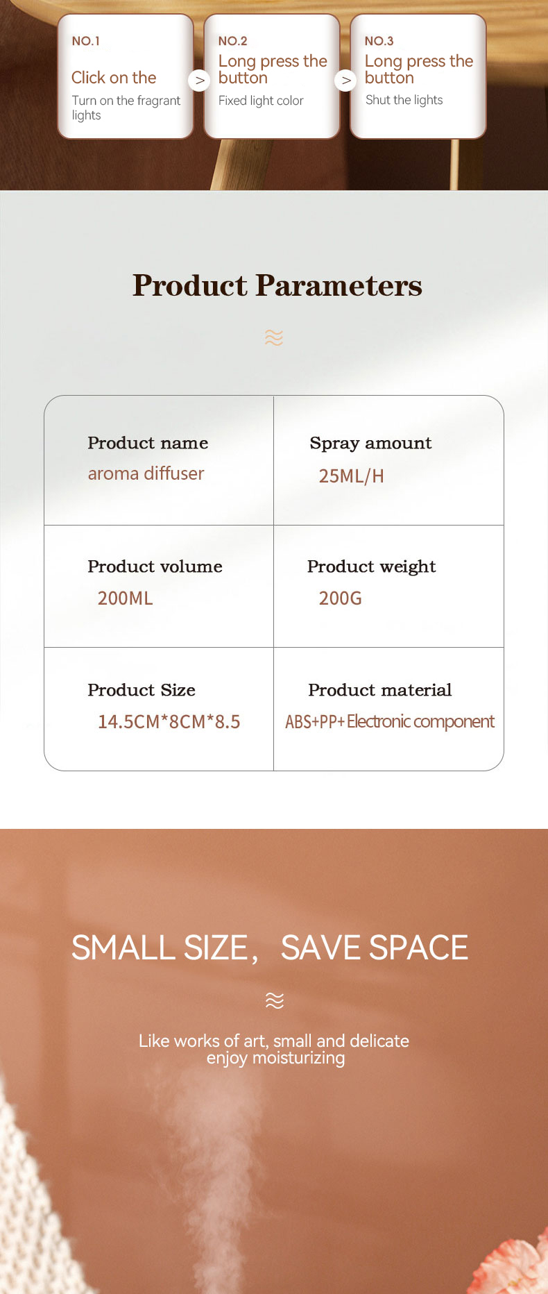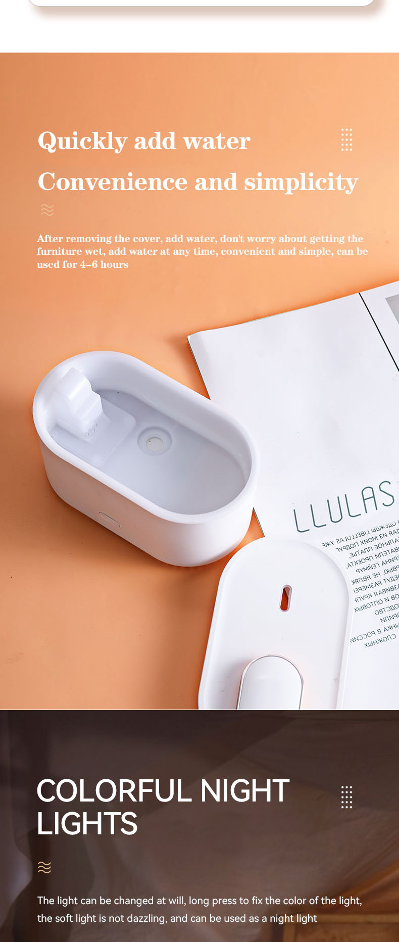 1.Function: Humidifier + Essential oil diffuser + Nigh Light (RGB Changing Color)