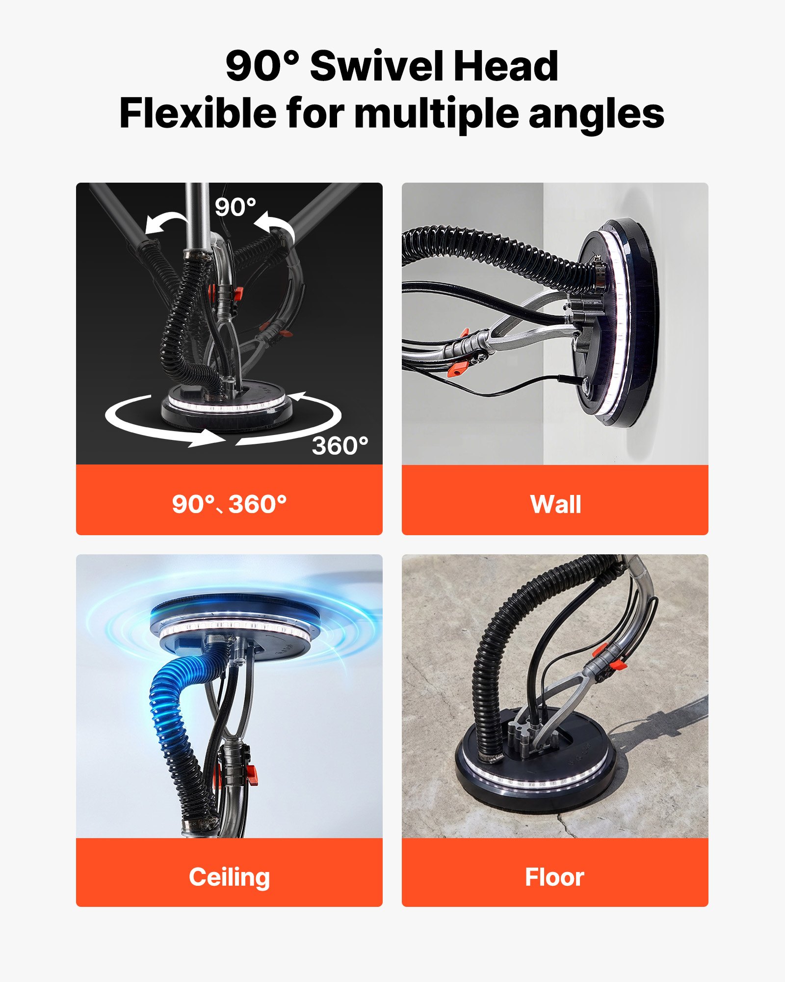 Flexible Operation: Our electric drywall sander is designed for maximum maneuverability with a 360° rotating sanding disc, a 90° swivel handle, and a detachable base. These features allow it to easily reach tight corners, edges, and narrow spaces