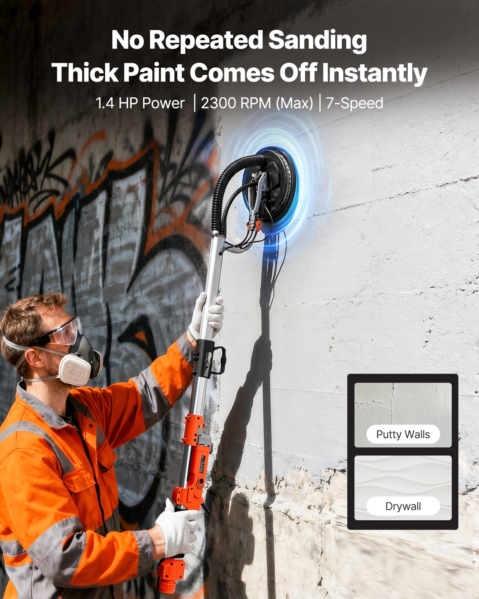 1.4 HP Powerful Motor: This drywall sander comes with a robust motor delivering up to 2200 RPM with 7 adjustable speeds. Ideal for walls, floors, and ceilings, it handles thin putty, thick paint, and aged surfaces with smoother, more effortless sanding
