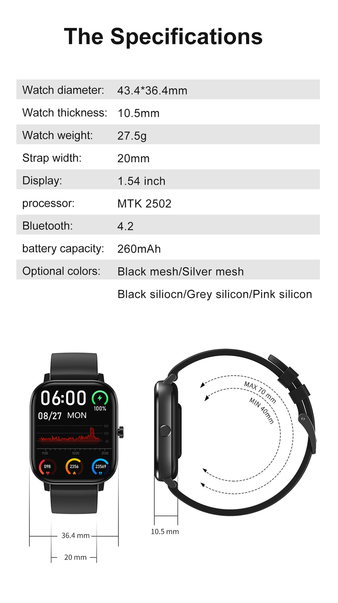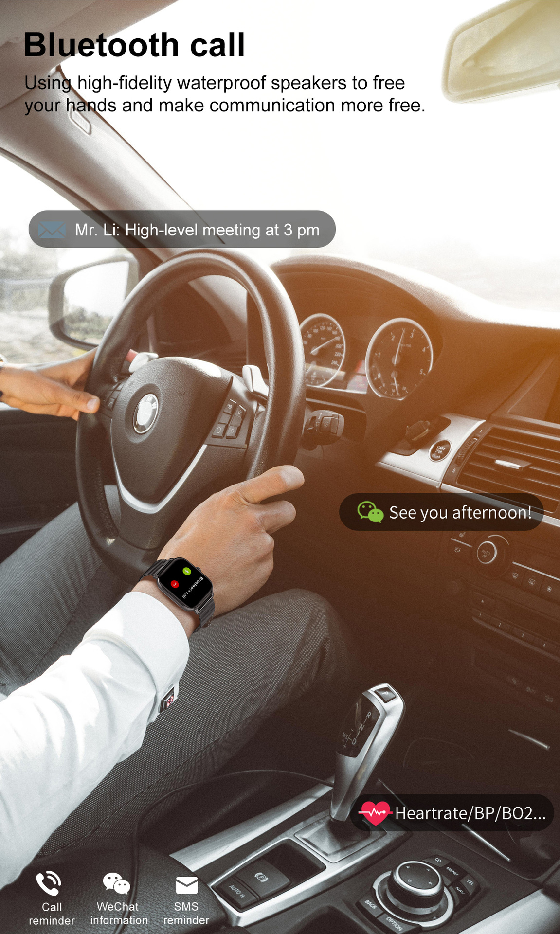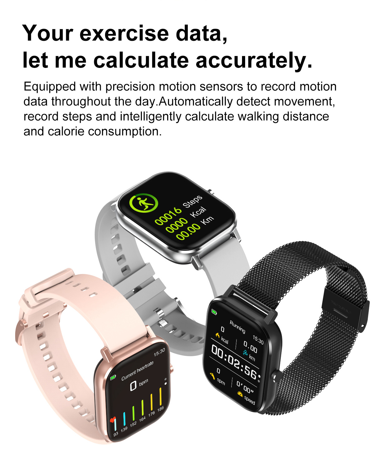 Additional features: step counting, smart reminder, remote control selfie, health monitoring, information push, sleep analysis