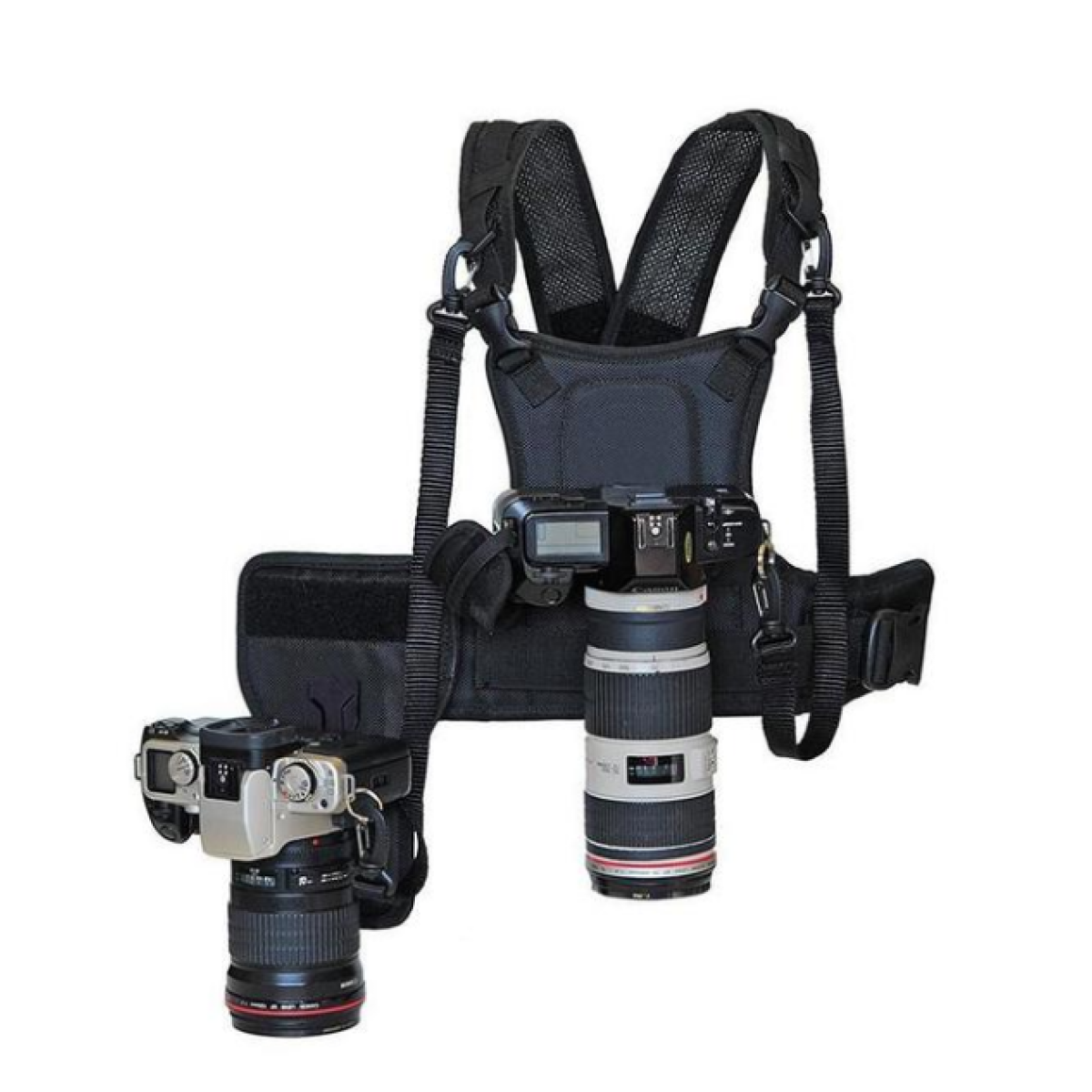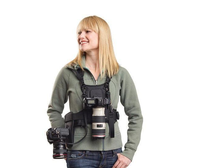 It’s a unique chest harness system that supports 1 or 2 cameras eliminating the neck strain usually associated with shooting long jobs such as weddings, sports, public relations and photojournalism.